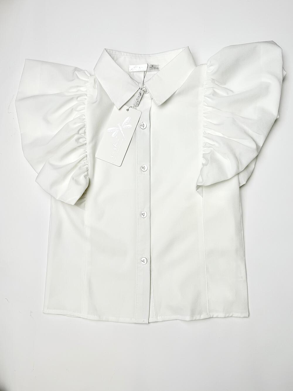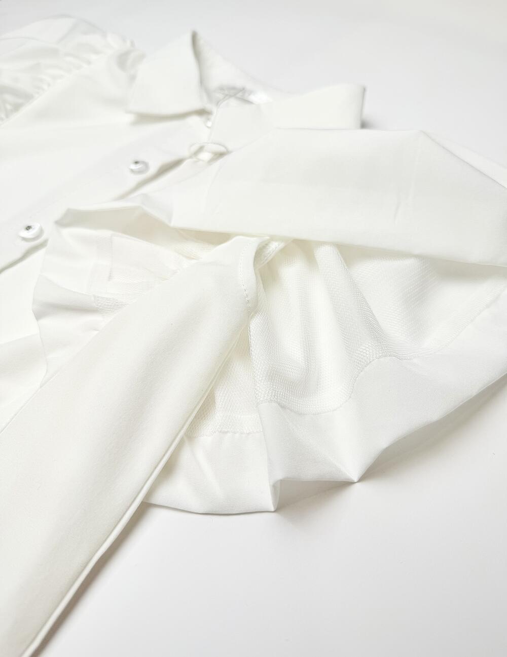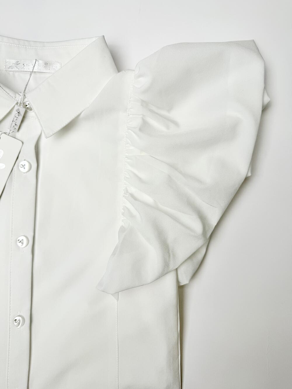 Біла блуза класичного крою з повітряними витонченими рукавами та деталізованими камінчиком ґудзиками. Додасть казковості та легкості у повсякденному стилі та святкові події.
