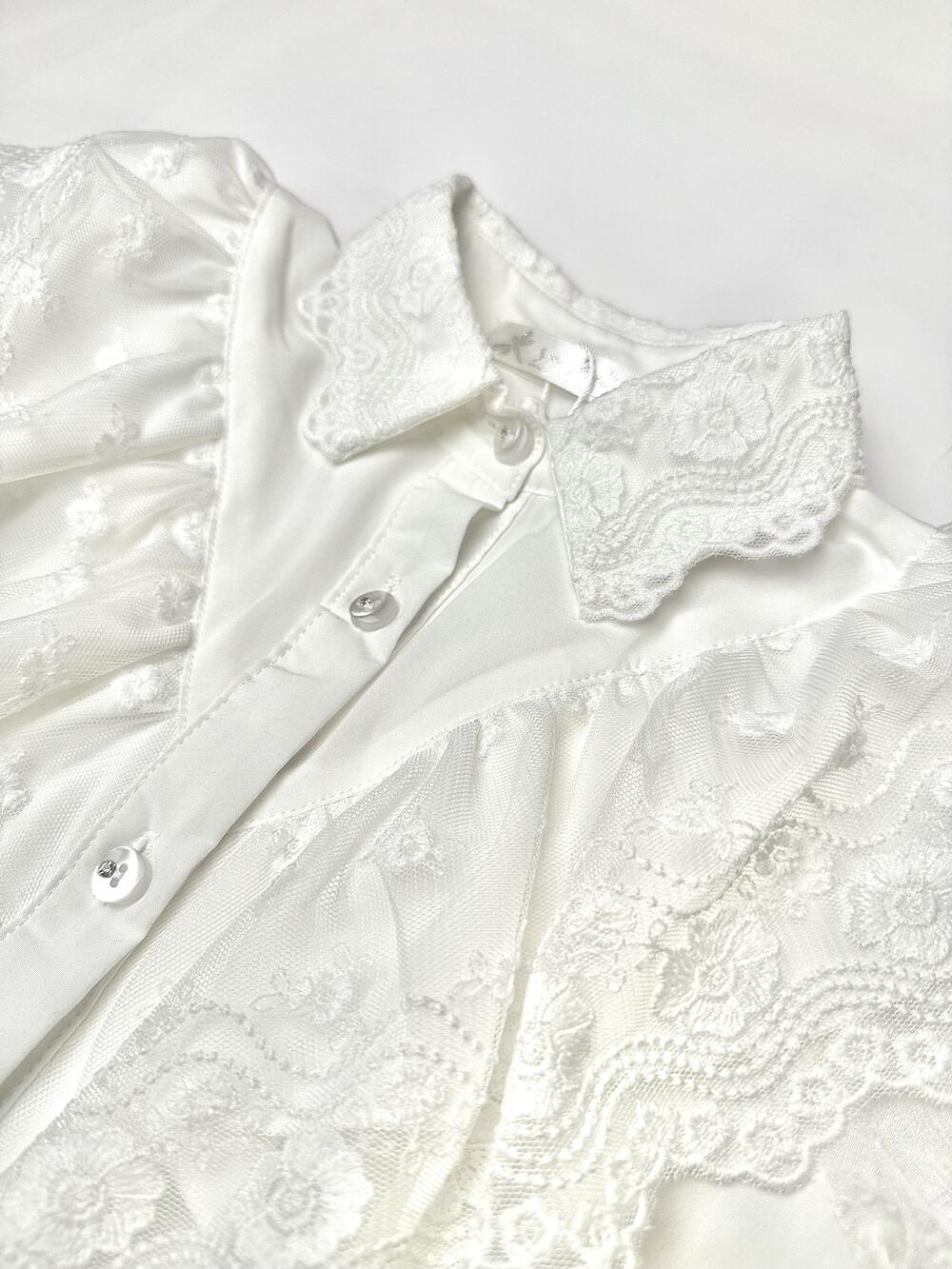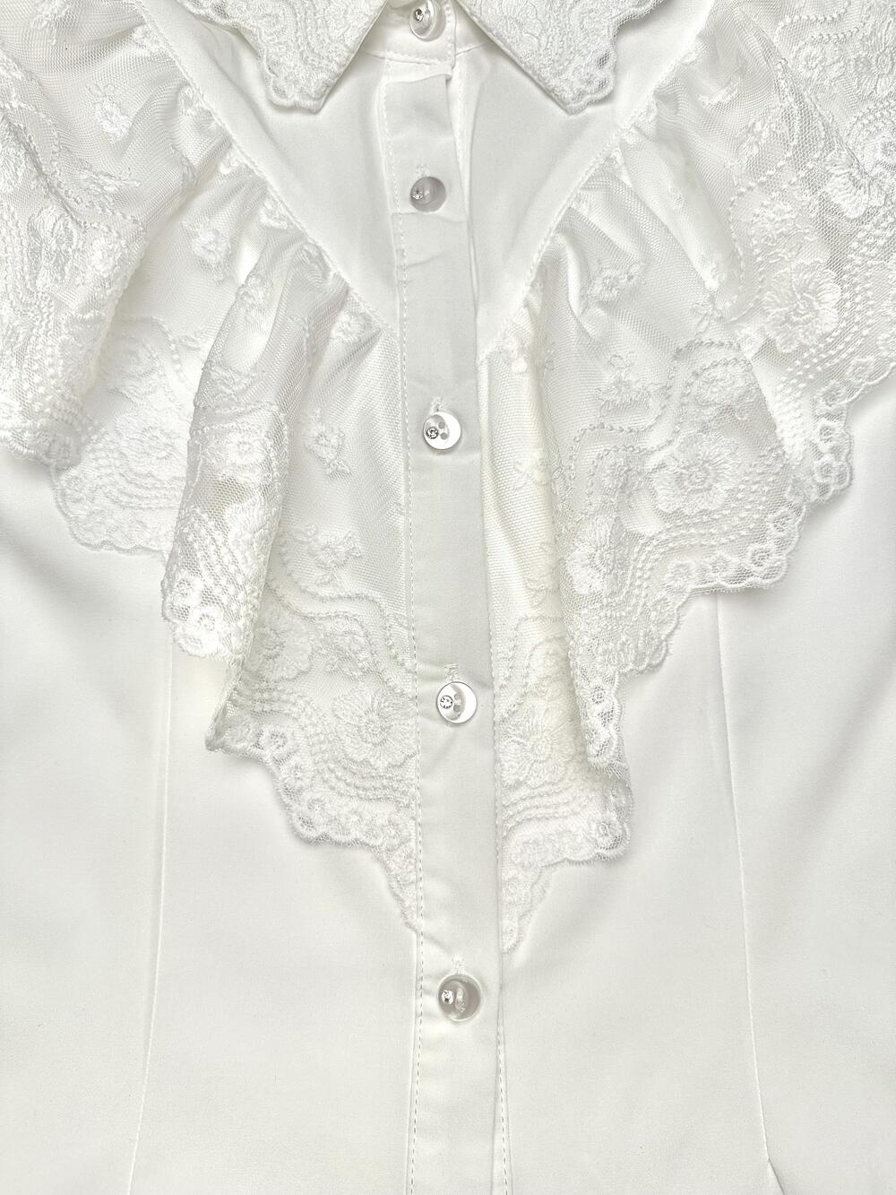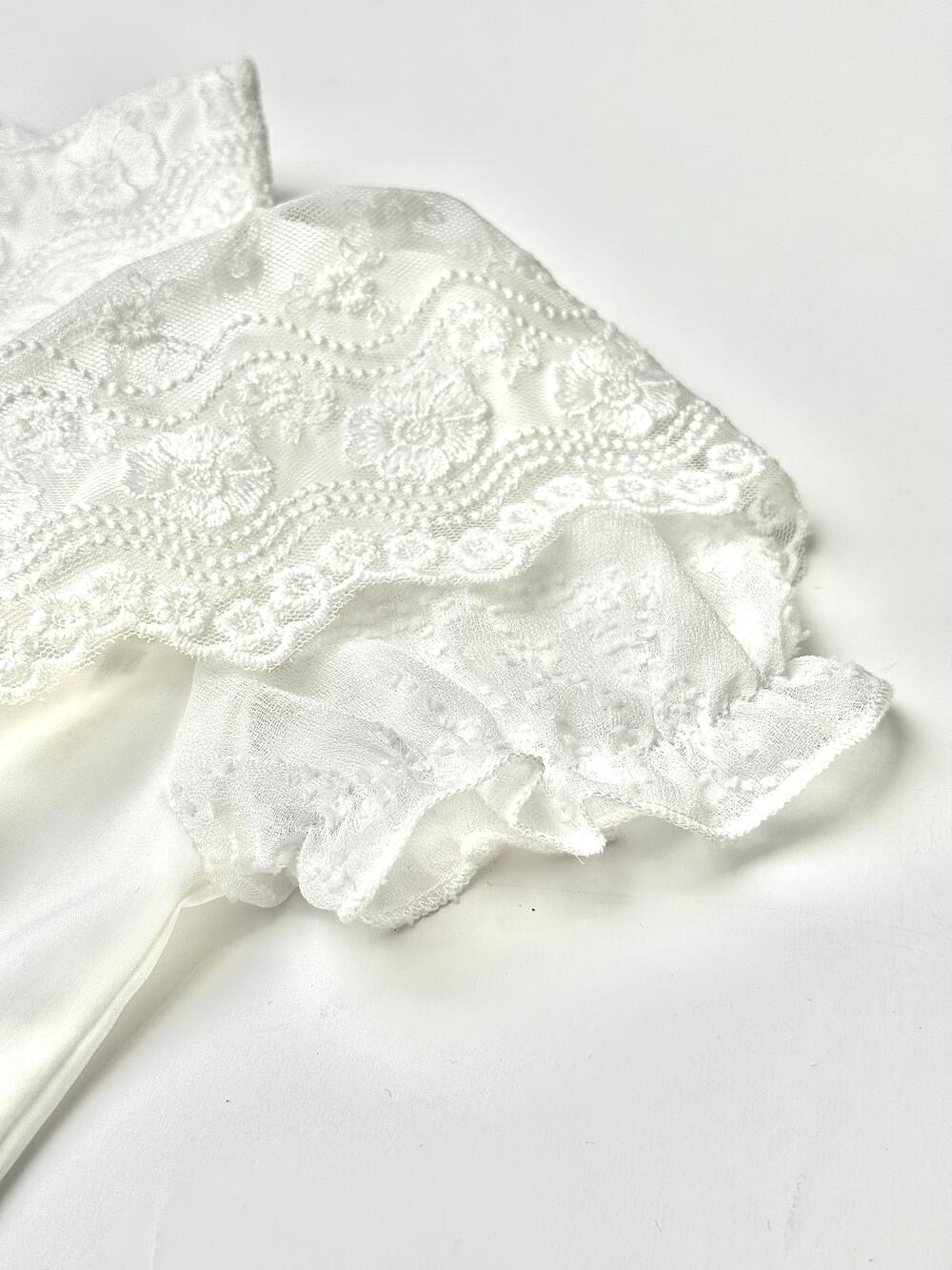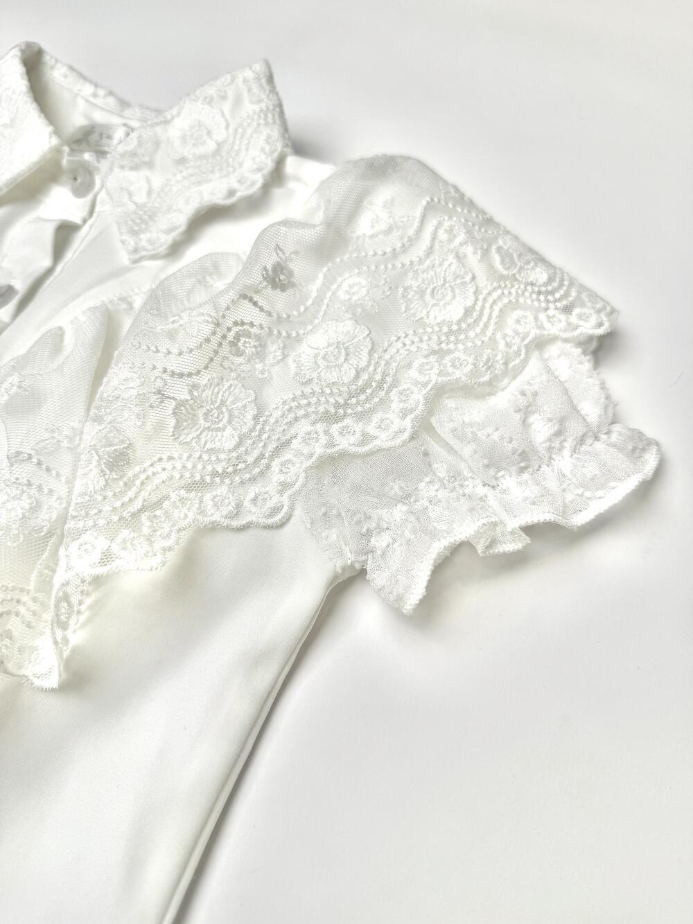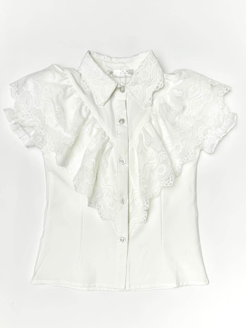 Блуза на короткий рукав у витонченому дизайні. Ажурне мереживо в тон блузі створює об’ємний силует на плечах та передній частині блузи. Ажурний комірець вдало доповнює, а