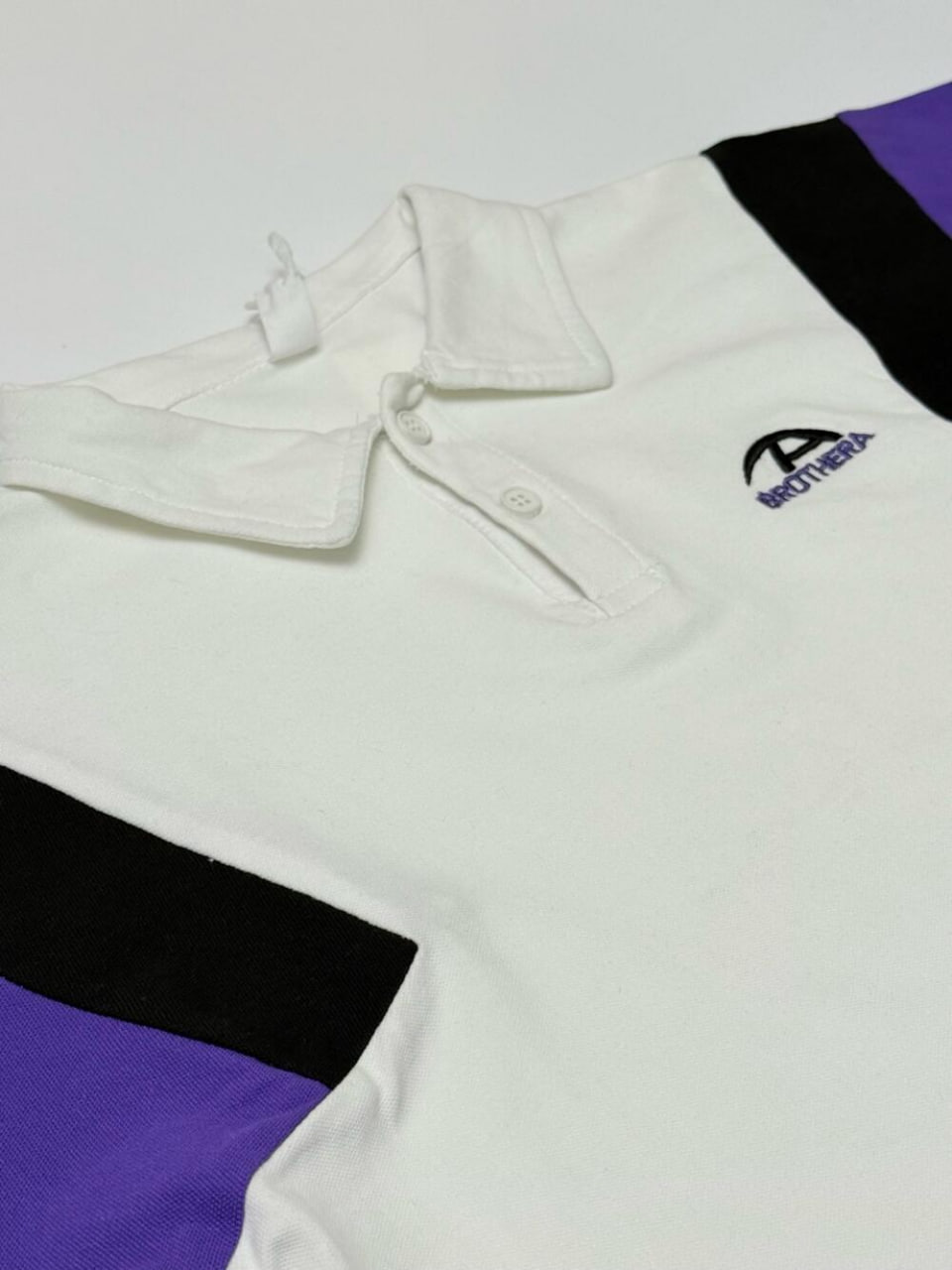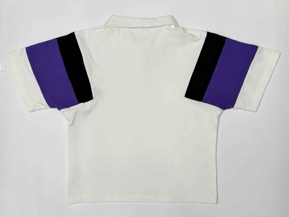Футболка поло, стилізована вставками насиченого фіолетового та чорного кольорів, які з’єднують рукави та основну частину білої футболки. З одного боку нашита мінімалістична емблема та надпис. Три акуратні ґудзики вгорі. Поєднання кольорів та геометрії створює стильний та продуманий дизайн. Виготовлена з м’якої, приємної на дотик тканини, яка забезпечує максимальний комфорт під час щоденного носіння та активних ігор. Приємна тканина дозволяє шкірі дихати, зберігаючи відчуття свіжості протягом усього дня.