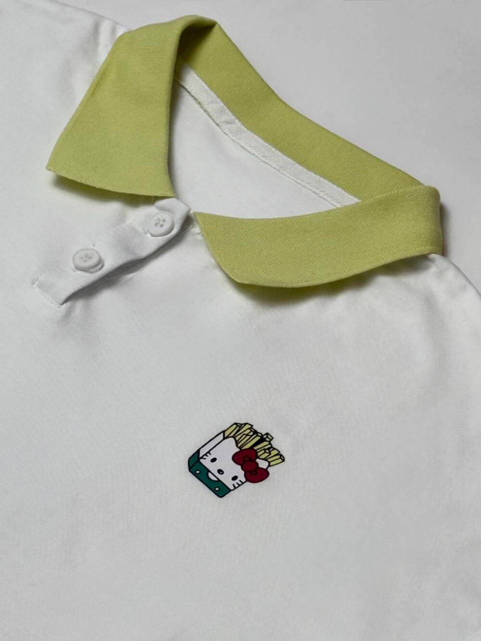 Футболка поло з трендовим лимонним коміром. Широкий та вільний крій. Чарівна наліпка з одного боку гармонійно доповнює акцентний комірець. Акурані ґудзикит спереду вгорі.