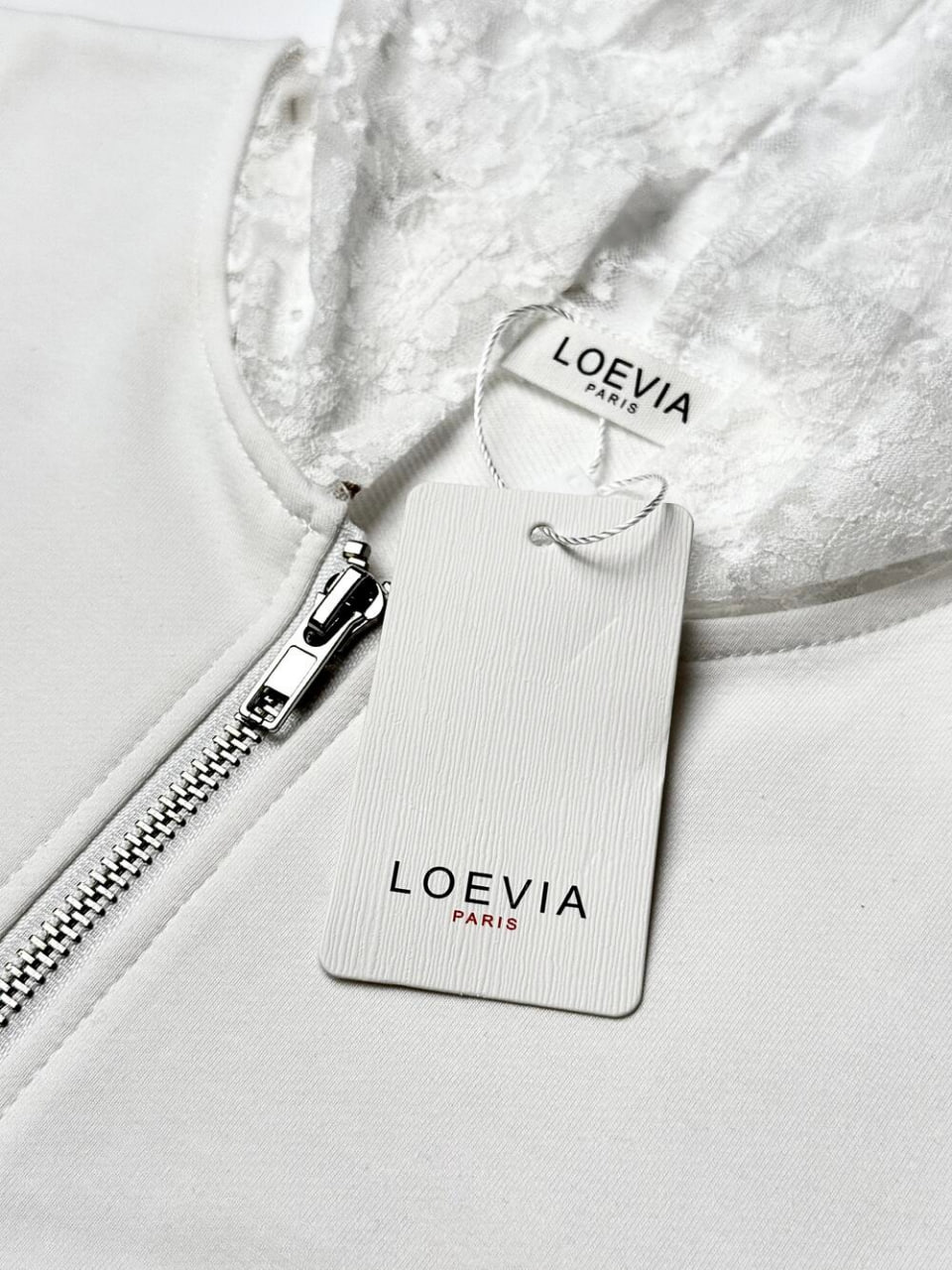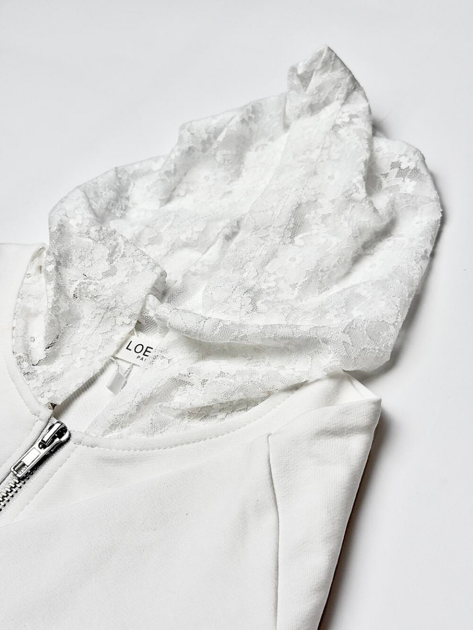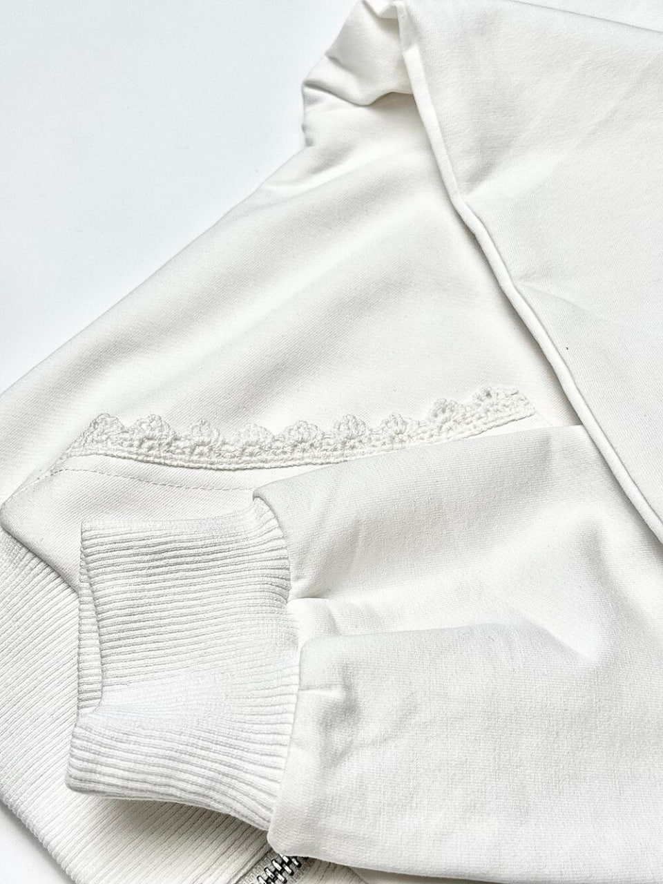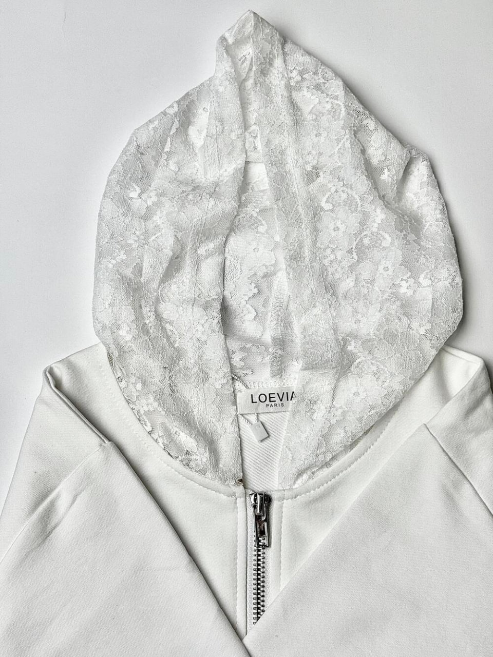 Худі із застібкою. Особливості та ніжності додає мереживний капюшоп та ажурні деталі на кишенях спереду.