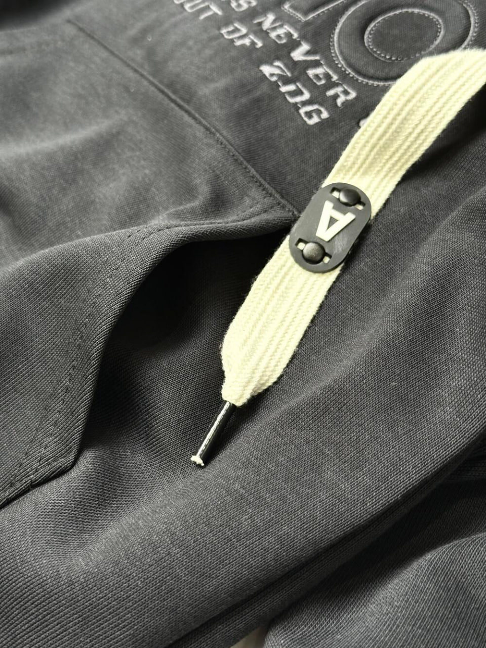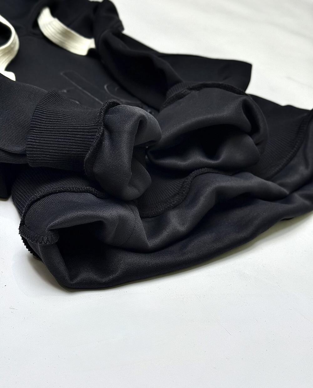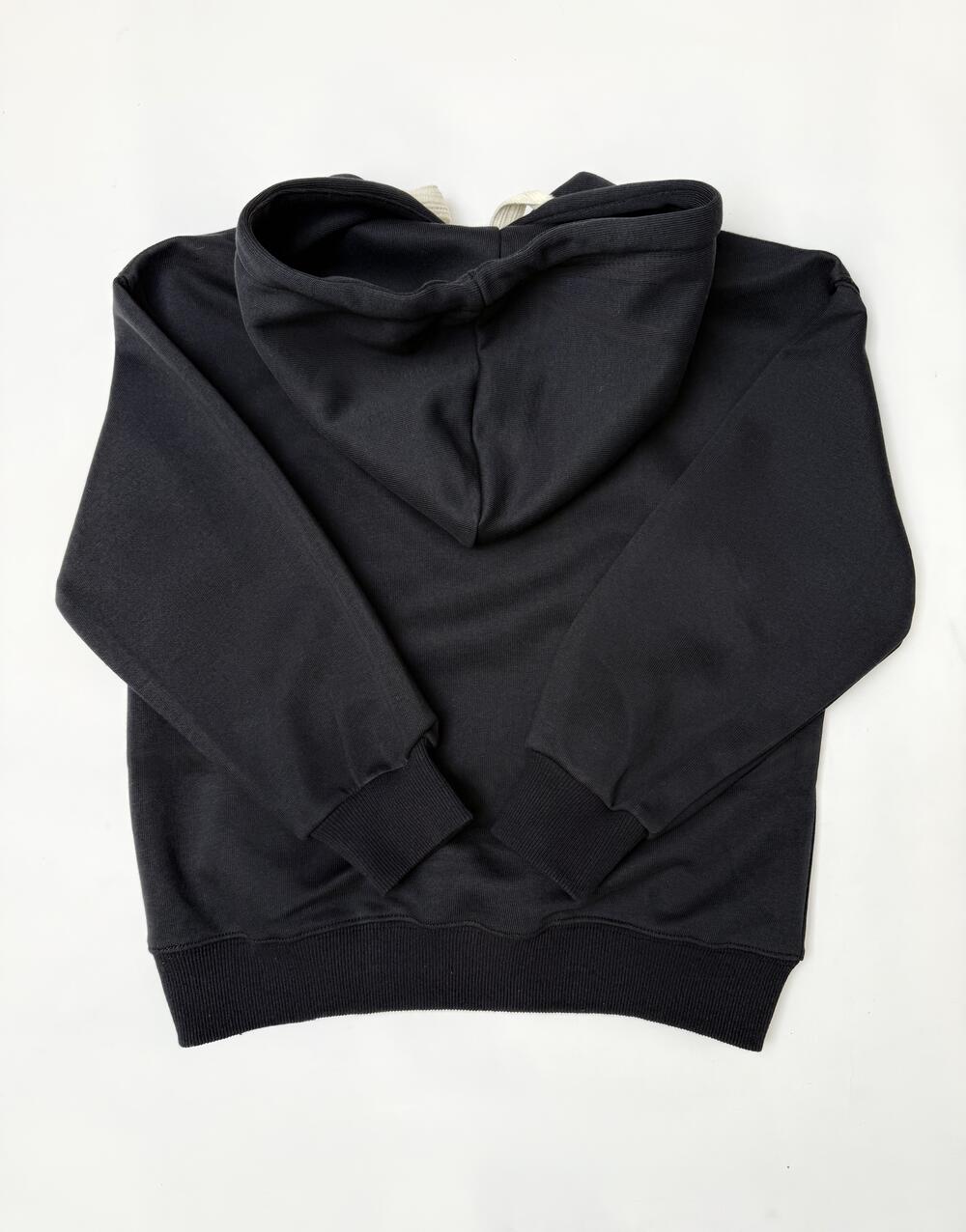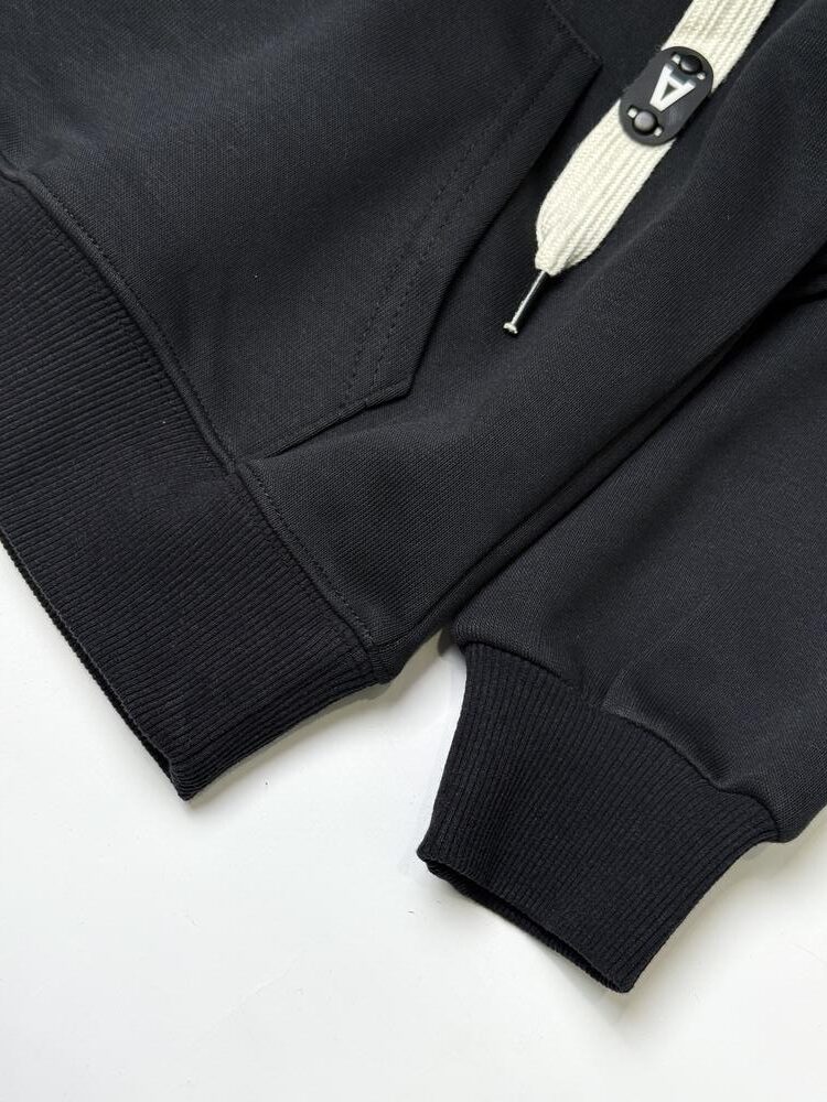 Базове чорне худі з акцентними світлими шнурками — мінімалізм, що завжди в тренді.
