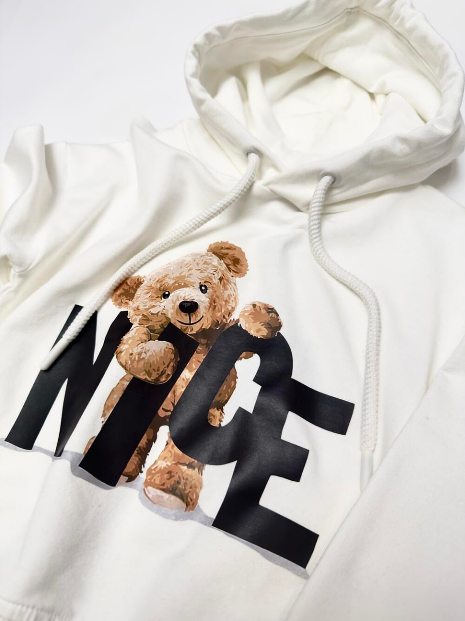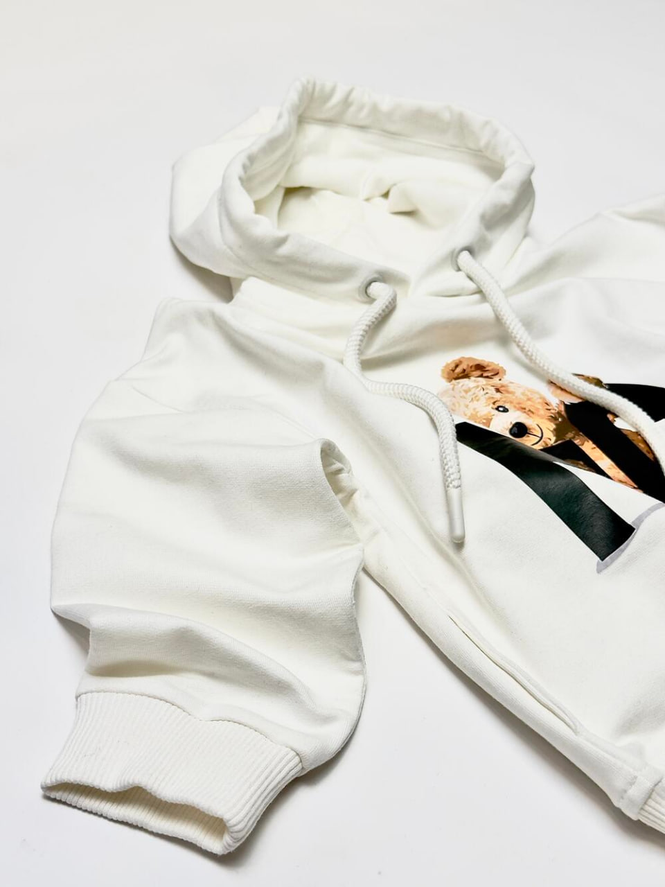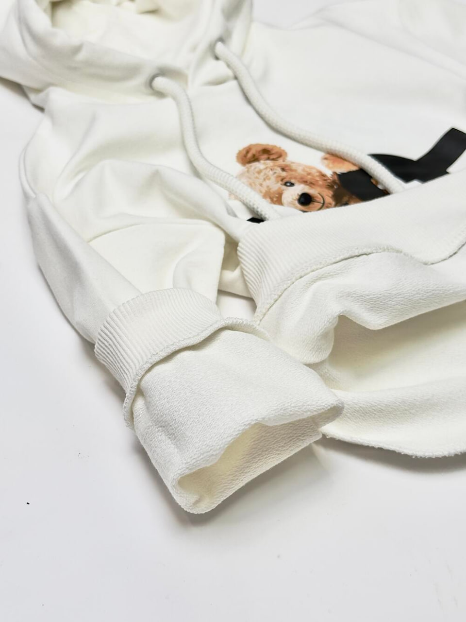 Універсальне худі з капюшоном та прихованими кишенями. Ніжна аплікація ведмедика і контрасний сучасний надпис – єдиний яскравий акцент.