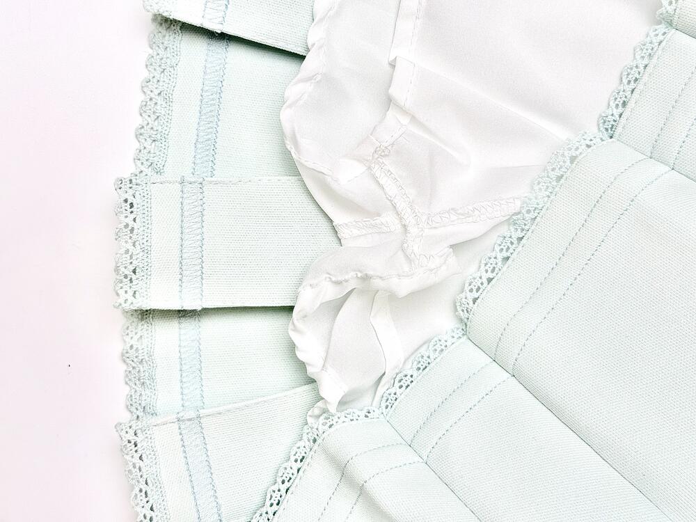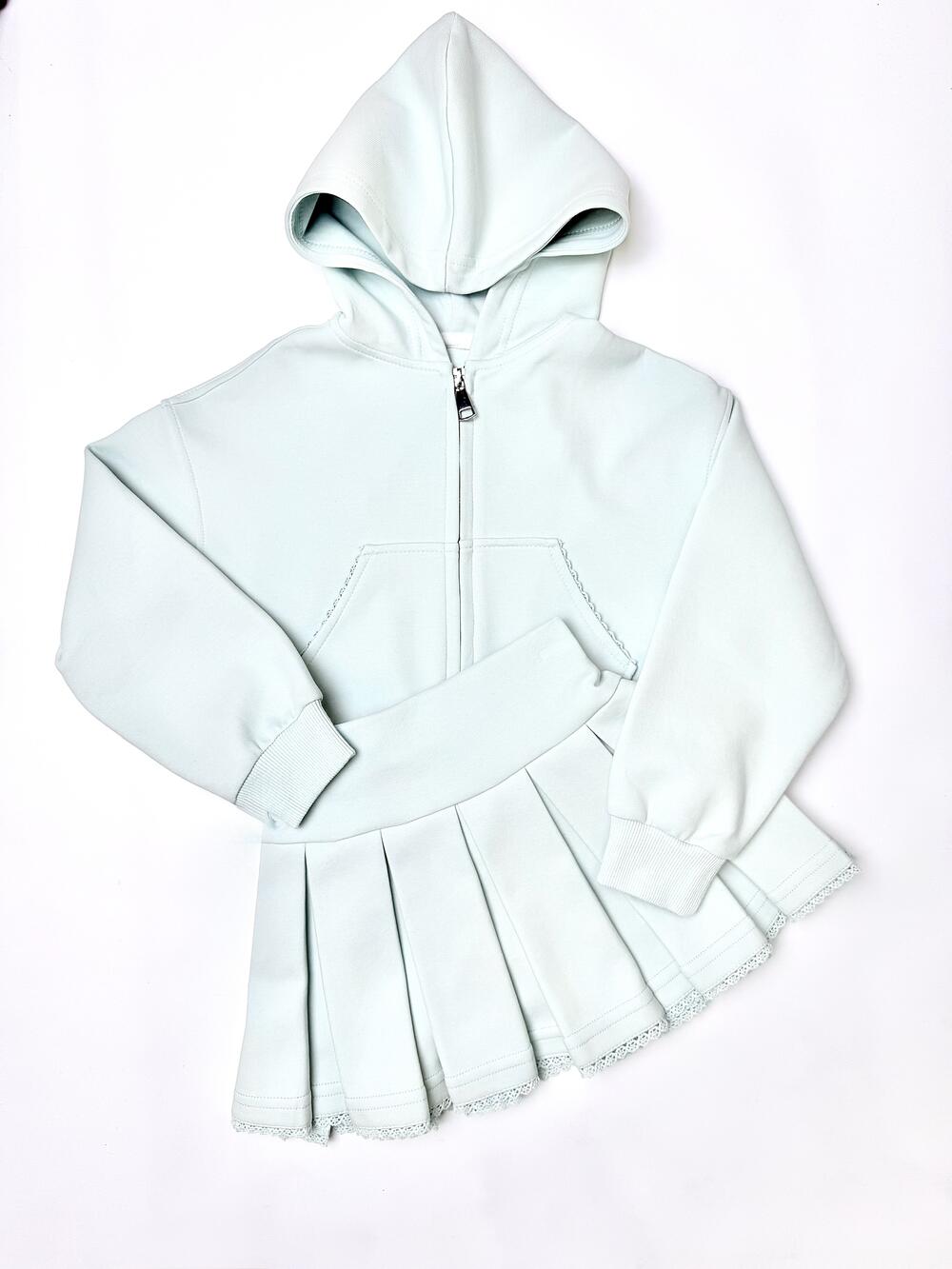 Костюм: спідниця в складку та світшот із застібкою та капюшоном. Ніжність створюють особливі деталі на кишенях спереду світшоту та по низу спідниці у вигляді цікавої вишивки в тон костюму.