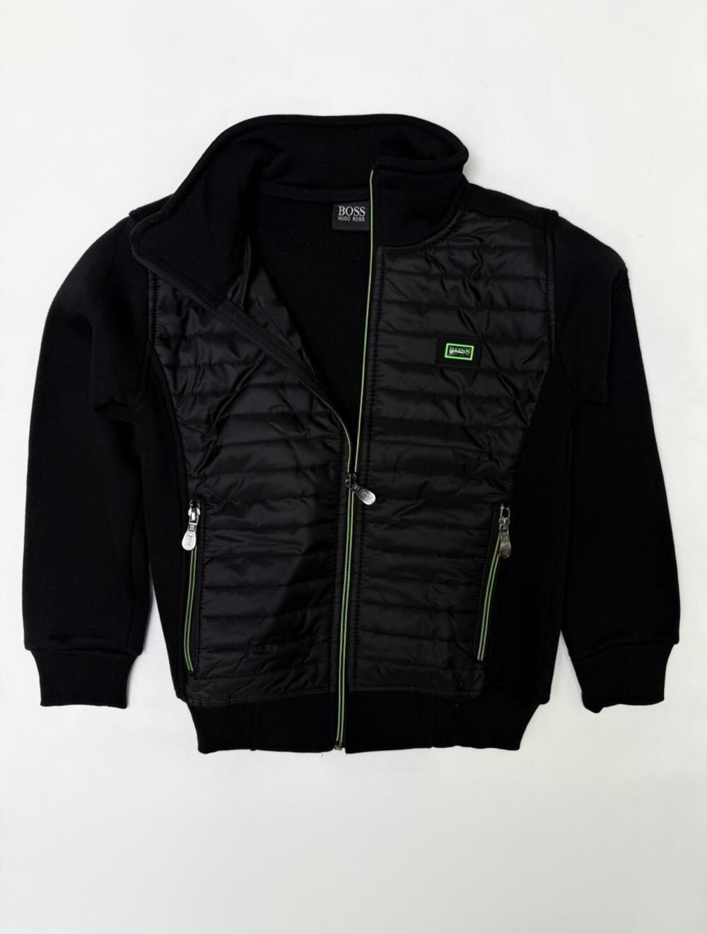 Верх із вставкою з плащової тканини спереду, коміром-стійкою та блискавкою. Є дві кишені на застібках і дрібні зелені акценти в дизайні.