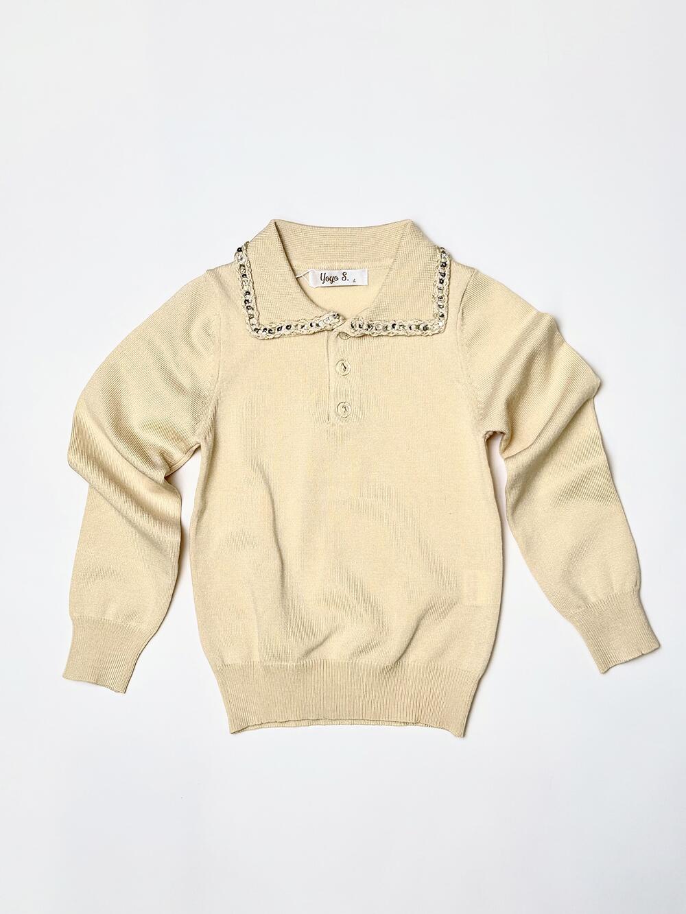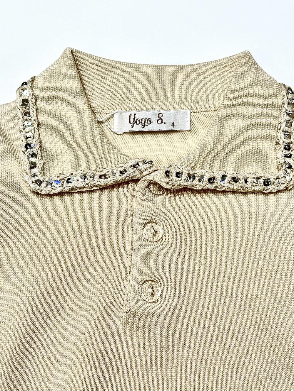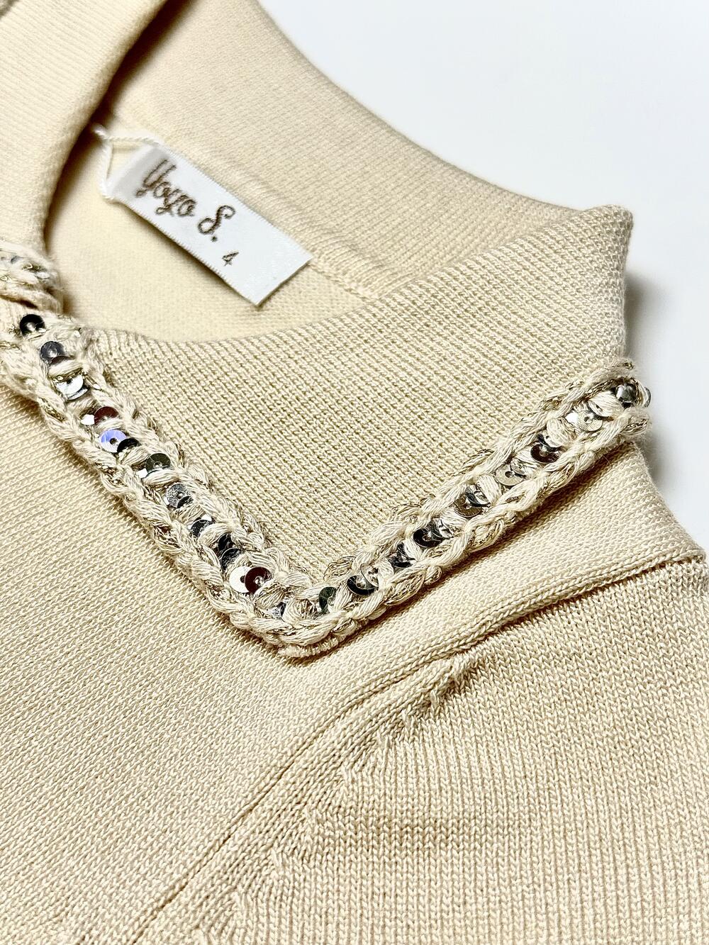 Кофта з відкладним коміром декорована тонкими сріблястими елементами та трикотажним плетенням по краю. Прозорі ґудзики додають акуратності образу. Манжети та низ виробу — на м’якій еластичній резинці.