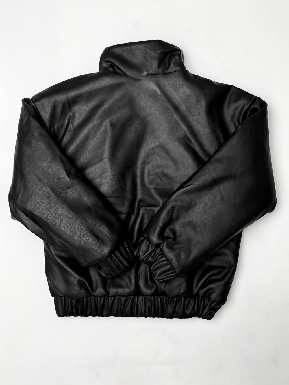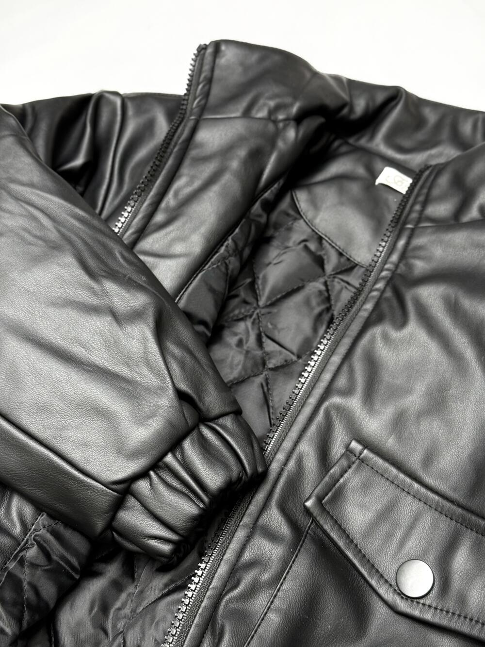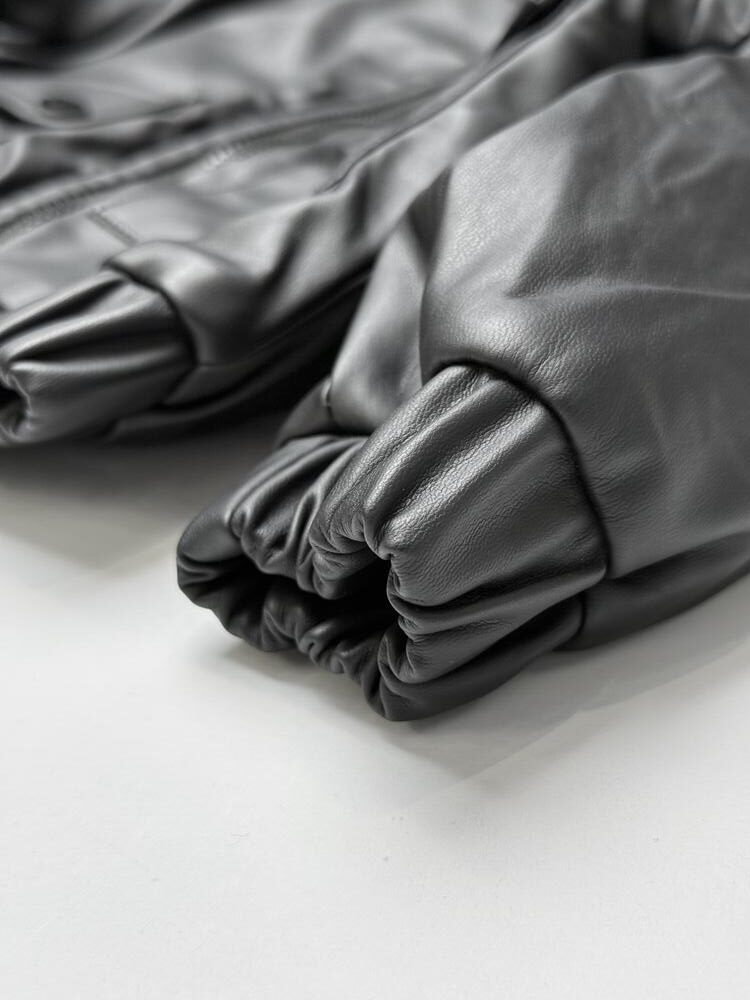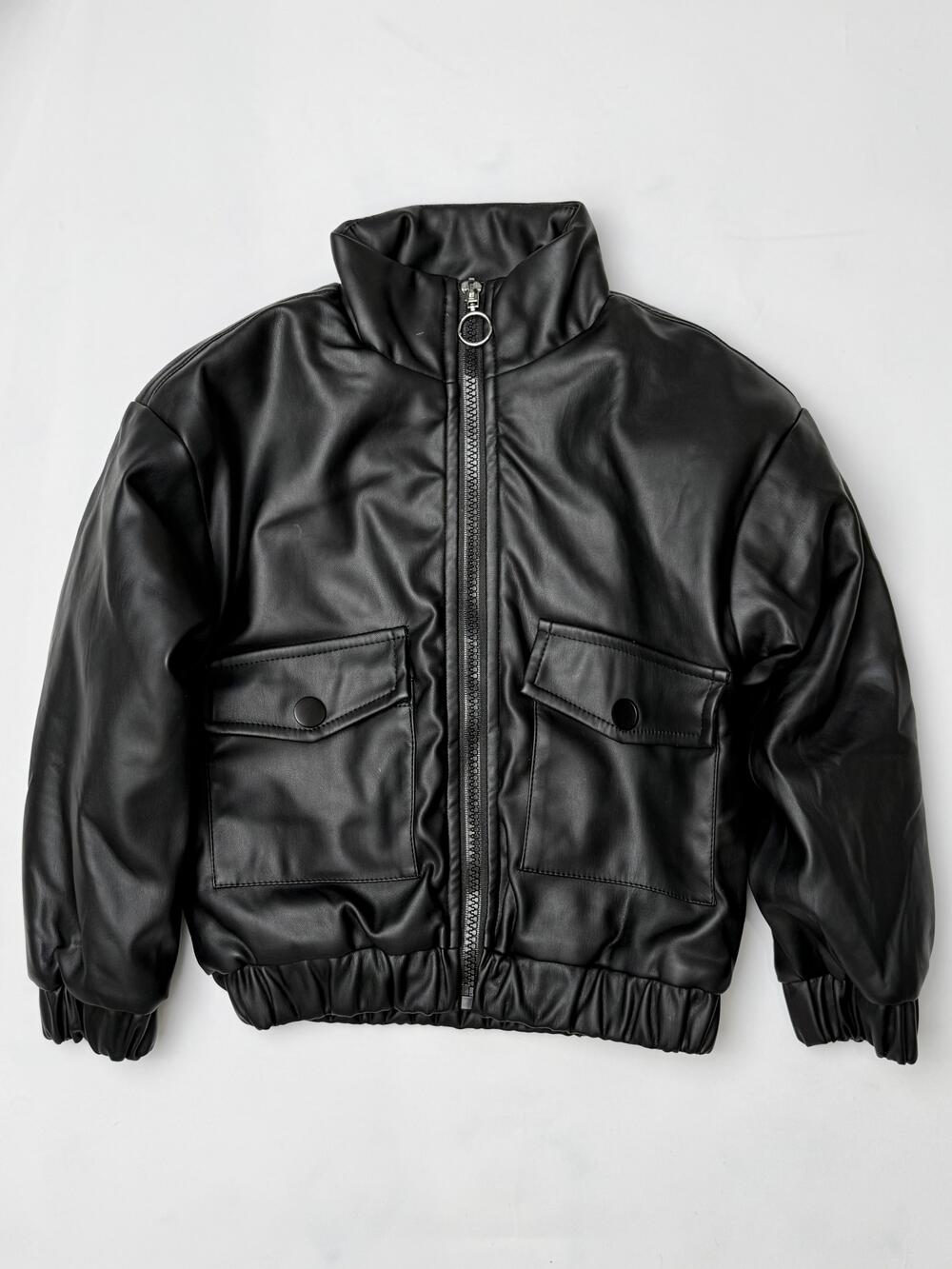 Лаконічна чорна куртка-бомбер зі штучної шкіри з акцентом на мінімалістичний дизайн. Модель має трендовий комір-стійку, еластичні манжети й пояс, що добре тримають форму та захищають від вітру. Попереду — накладні кишені з клапанами й блискавка з масивним кільцем. Ідеальний вибір для стильного повсякденного образу — виглядає сучасно, з характером і легко поєднується з джинсами чи худі.