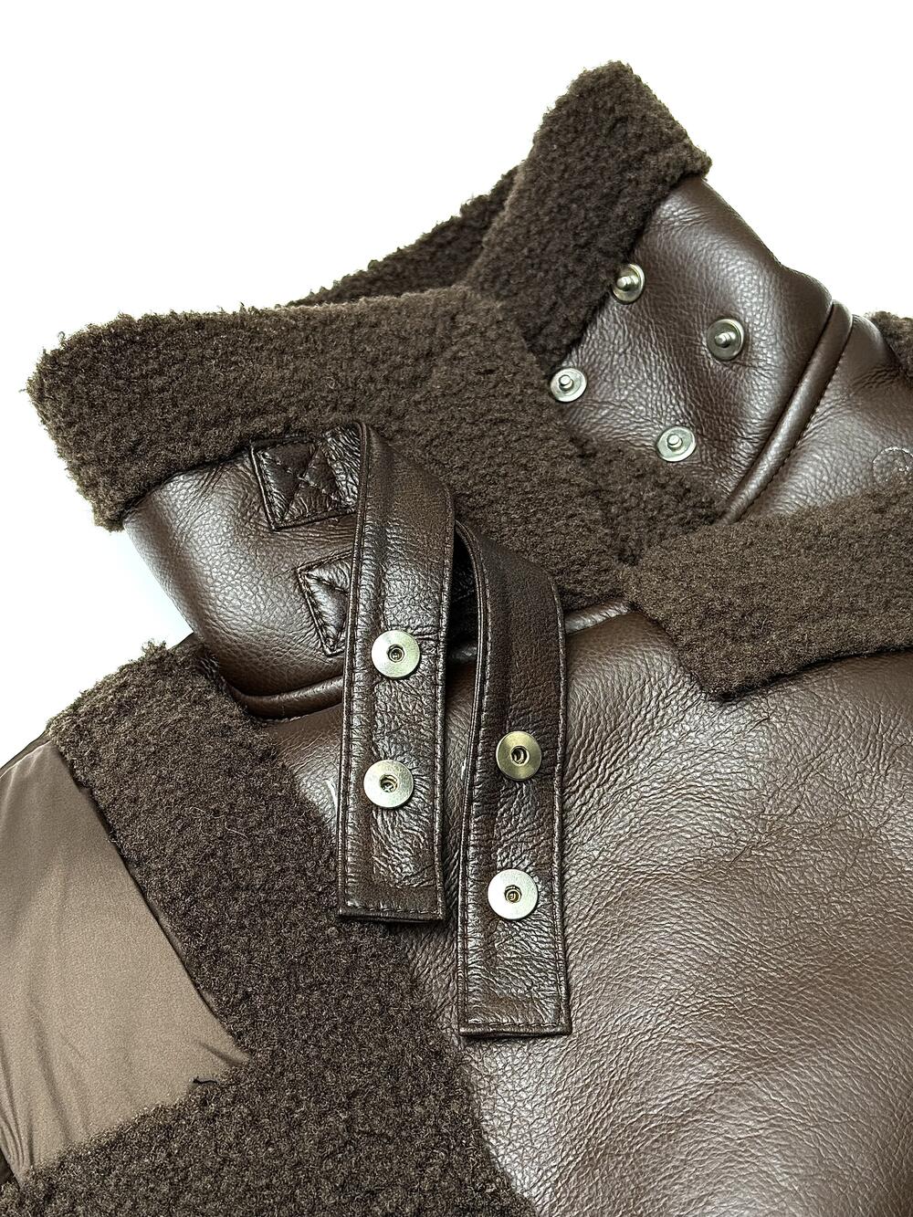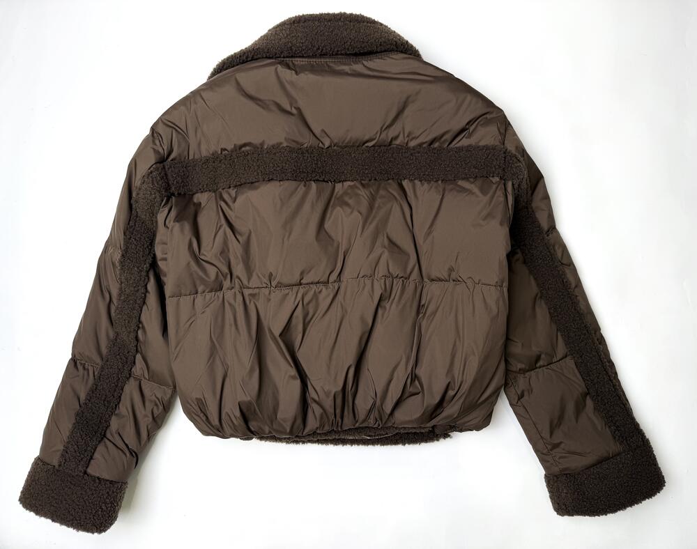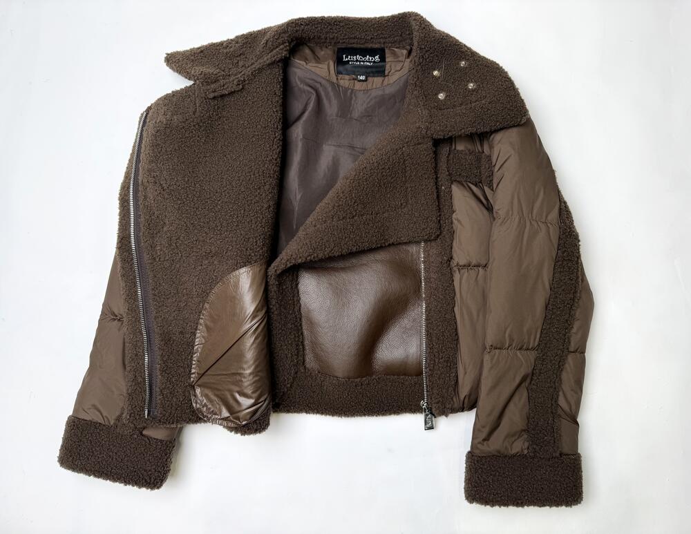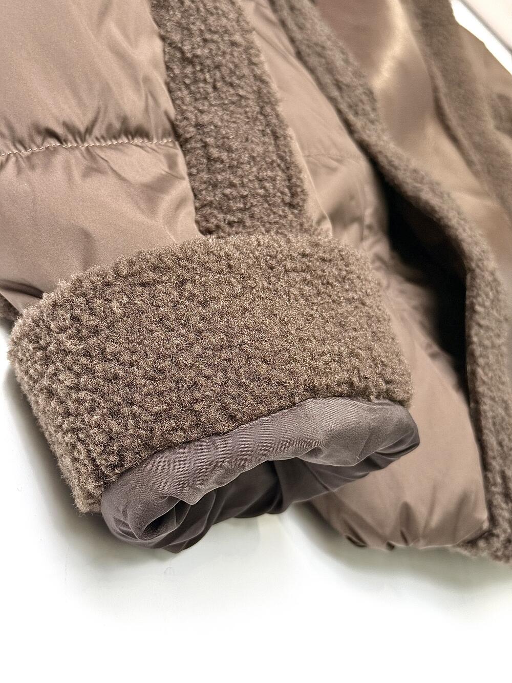 Тепла куртка з комбінацією фактур: матова тканина поєднана з декоративними вставками зі шкірзамінника та м’якого хутра. Модель має високий комір із застібкою, манжети й пояс із хутряною обробкою, а також застібку-блискавку. Завдяки щільному утеплювачу куртка забезпечує комфорт і стиль у холодну пору року.