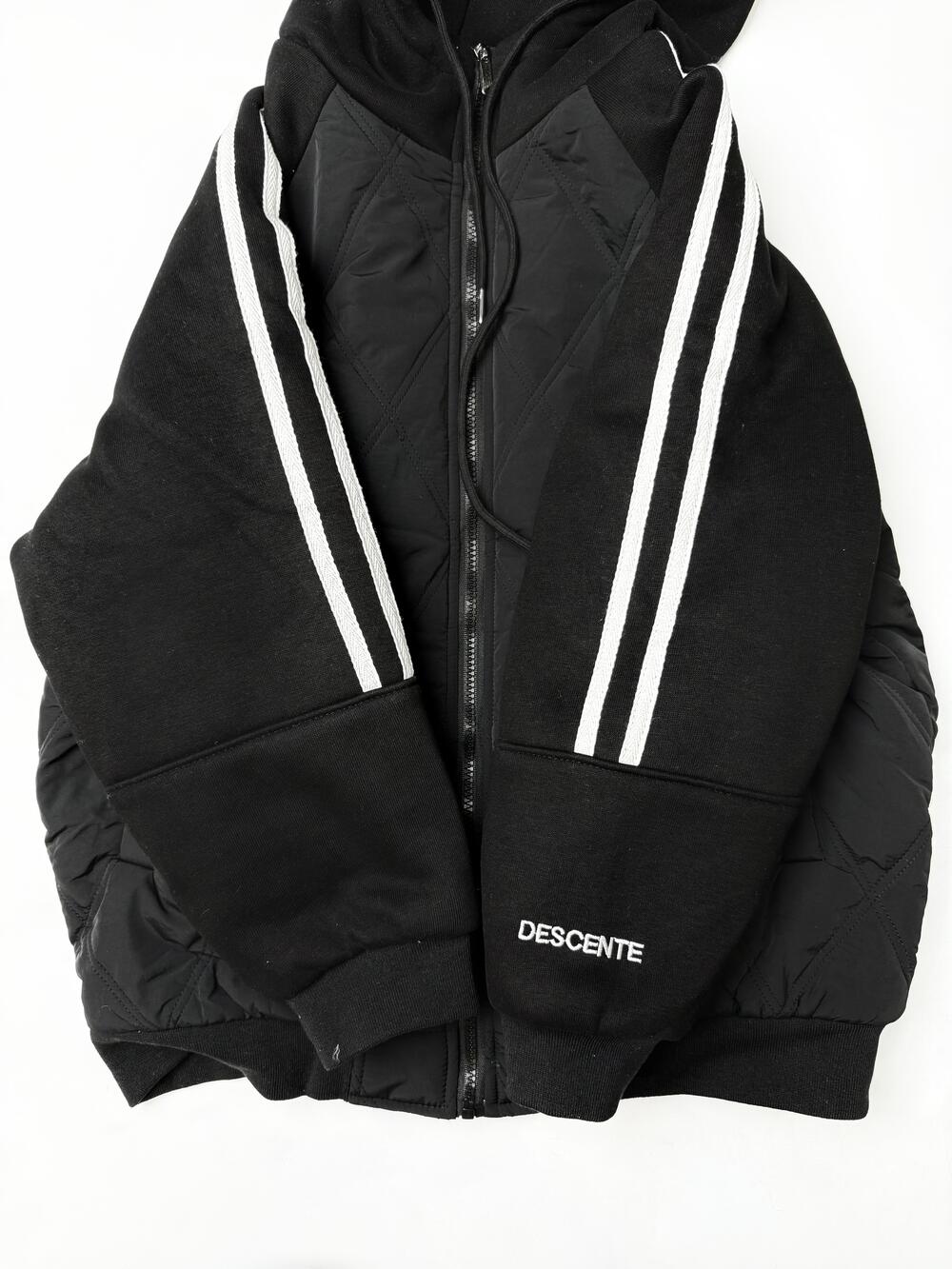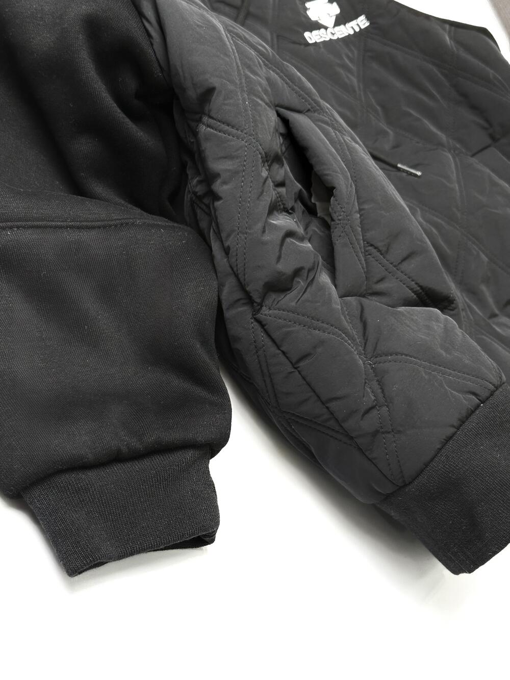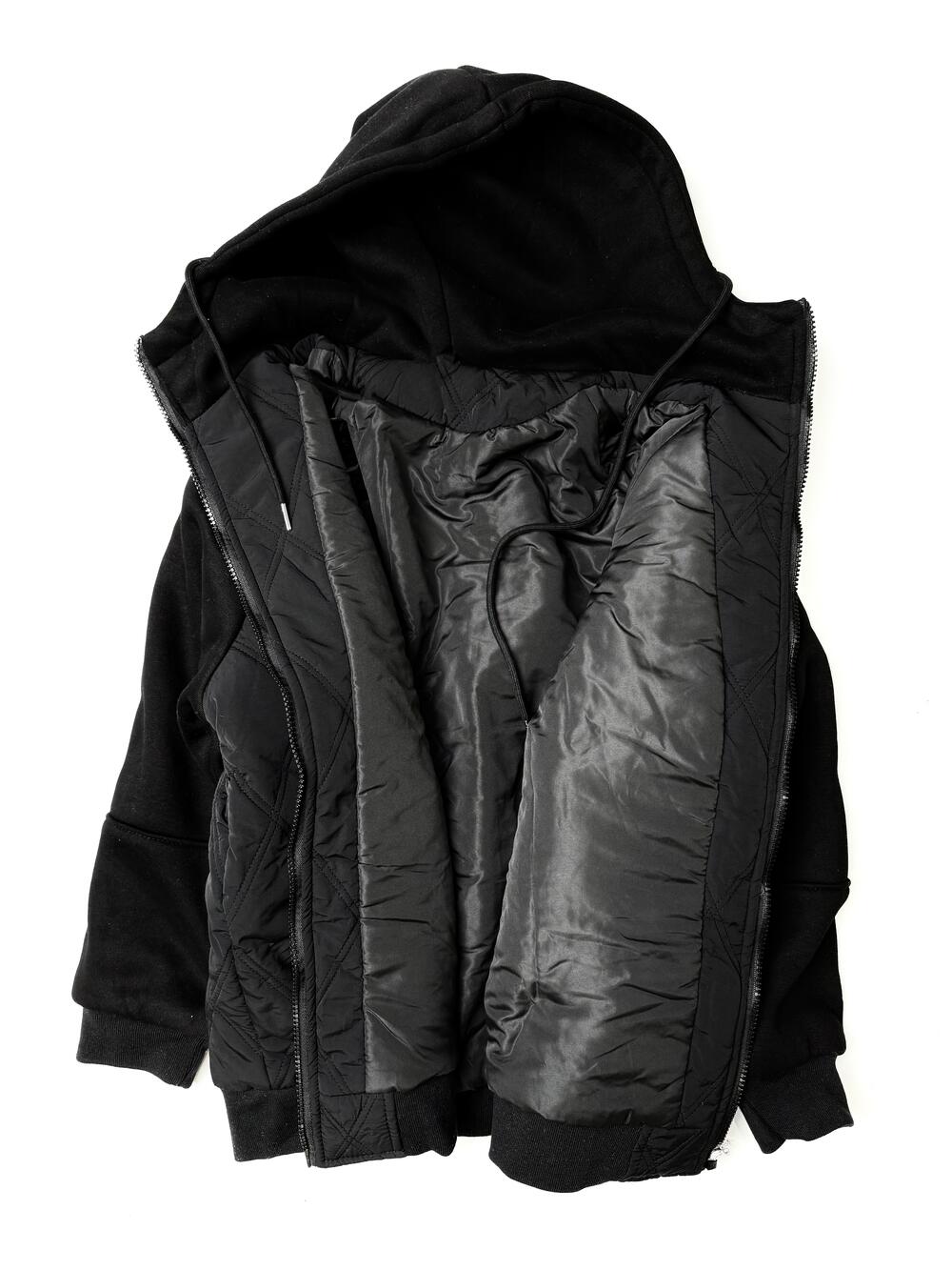 Зручна модель 2в1 — поєднання комфорту худі та тепла куртки. Має капюшон із шнурками, застібку-блискавку та еластичні манжети. Тканина комбінована: верх із м’якого трикотажу, перед і спина — стьобані з утепленням. Білі смуги на рукавах додають спортивного акценту. Ідеальний варіант для активних днів — легка, тепла й стильна.
