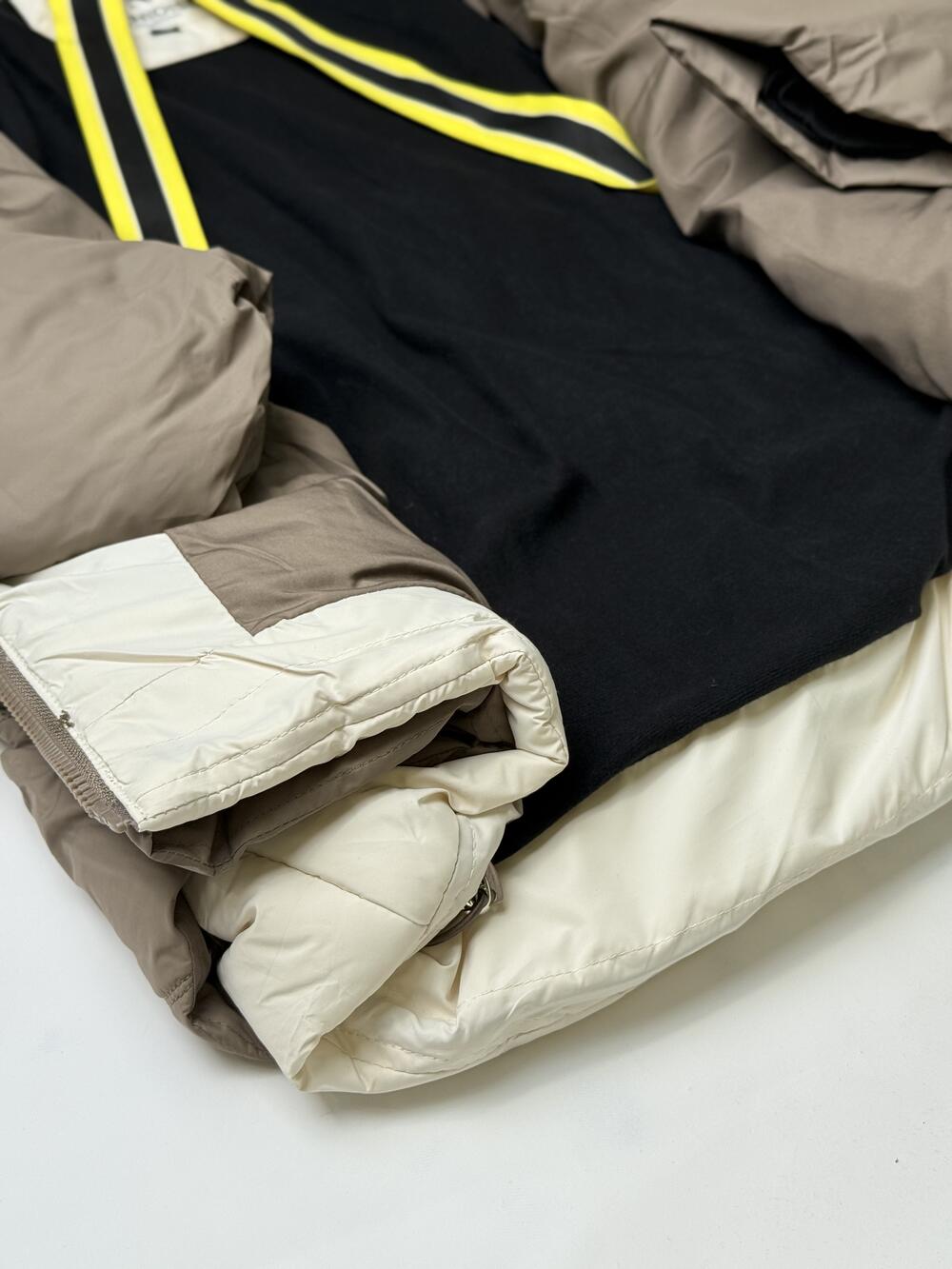 Куртка з світлим капюшоном.
