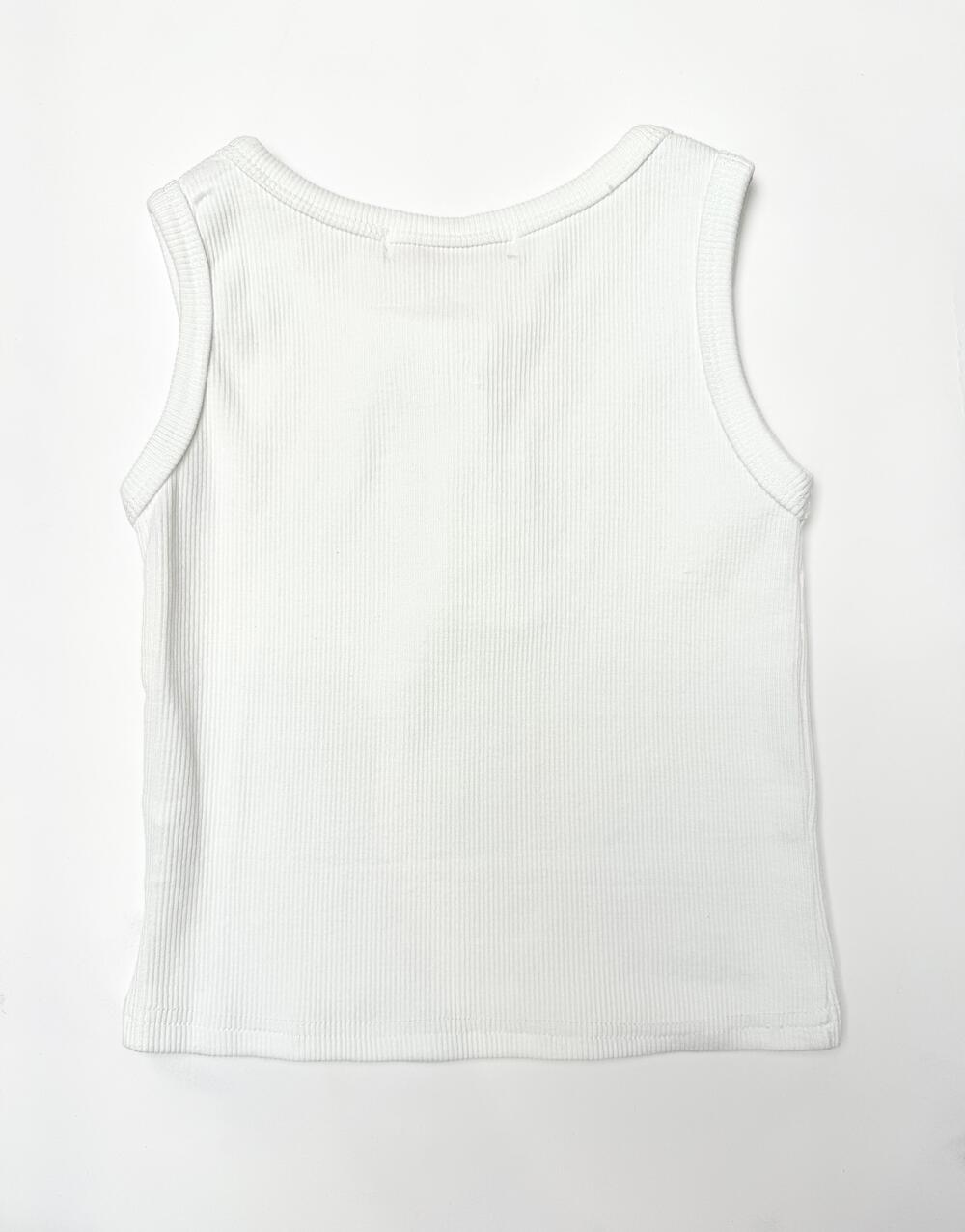 Біла майка в рубчик із двома маленькими гудзиками біля горла створює відчуття легкості й жіночності.