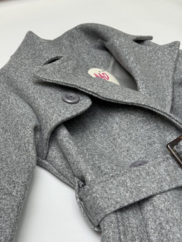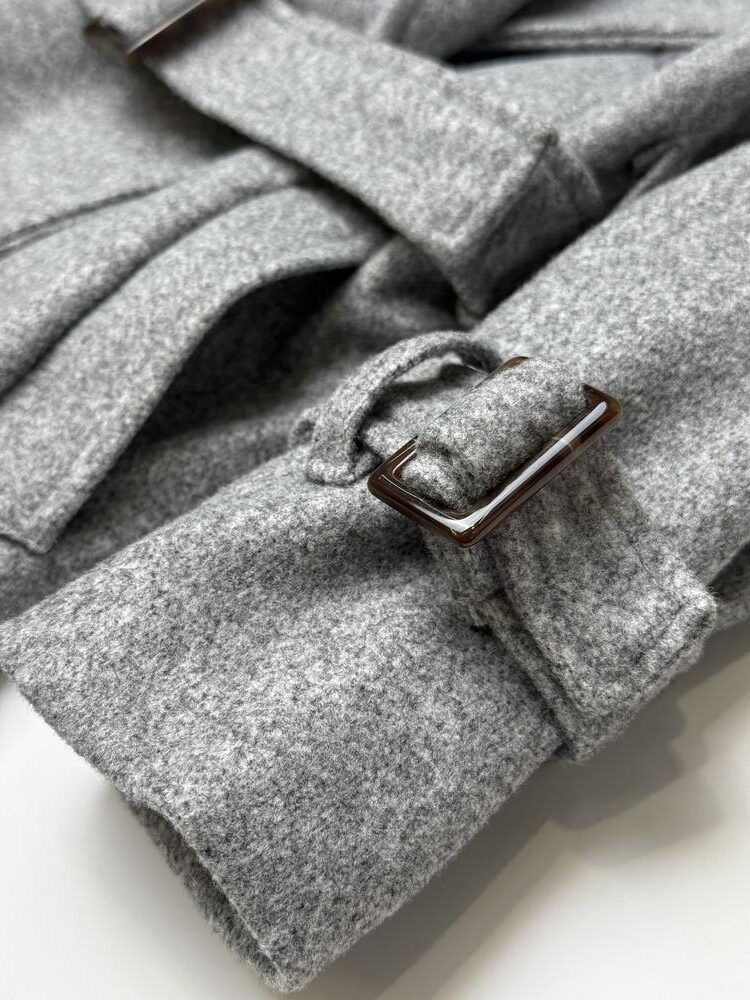 Елегантгі деталі: відкидний комір, нашивка з ґудзиком з одного боку, регулюючі паски внизу на рукавах.