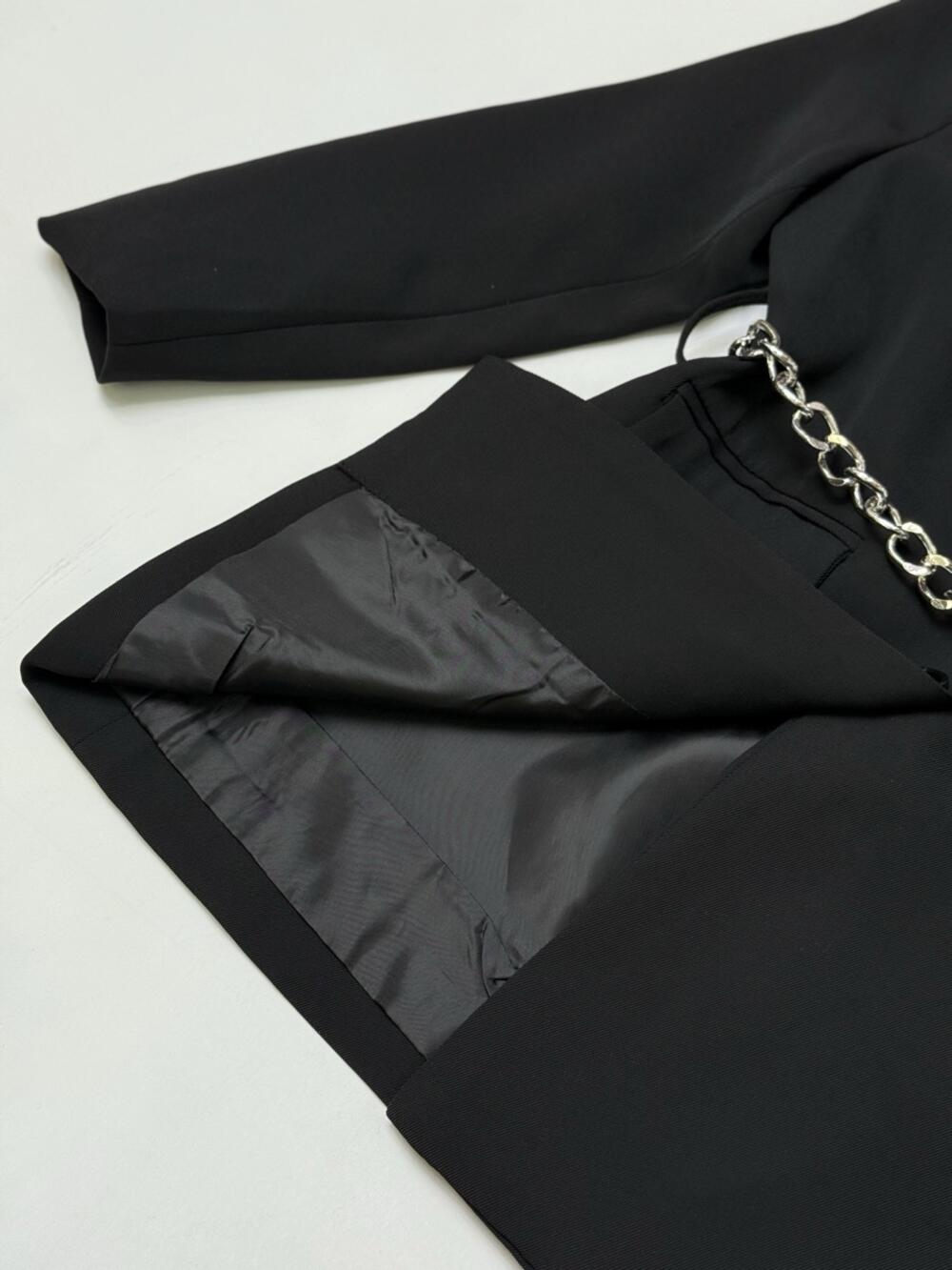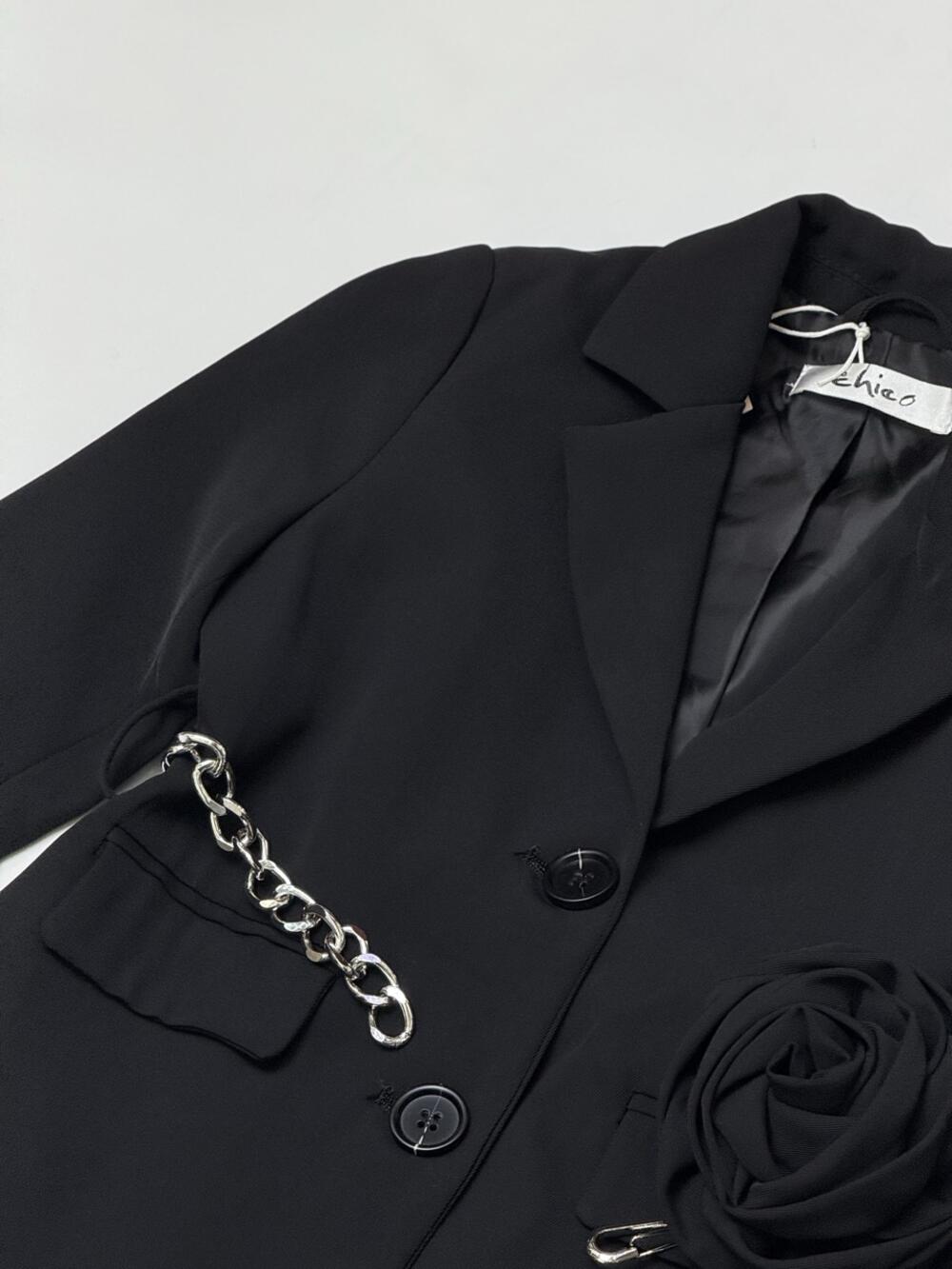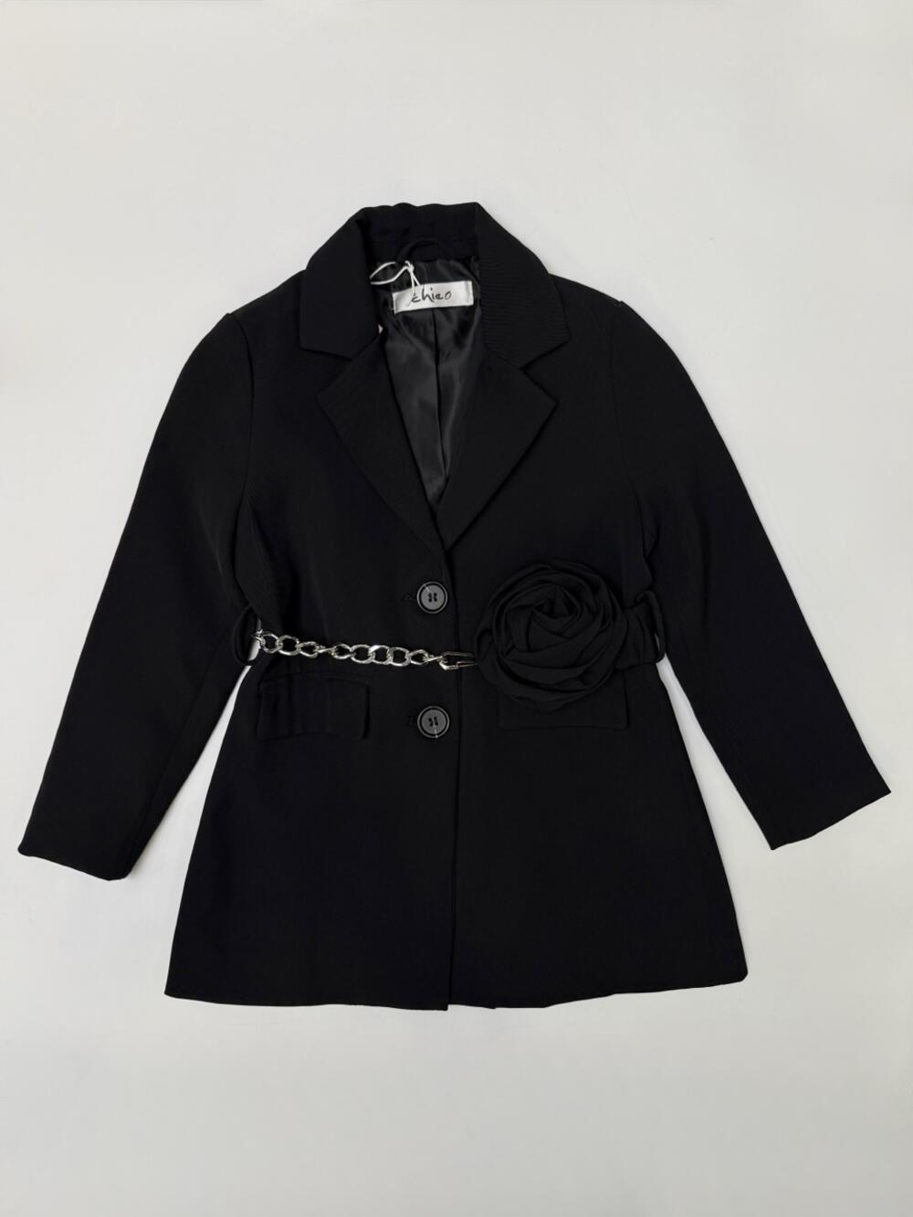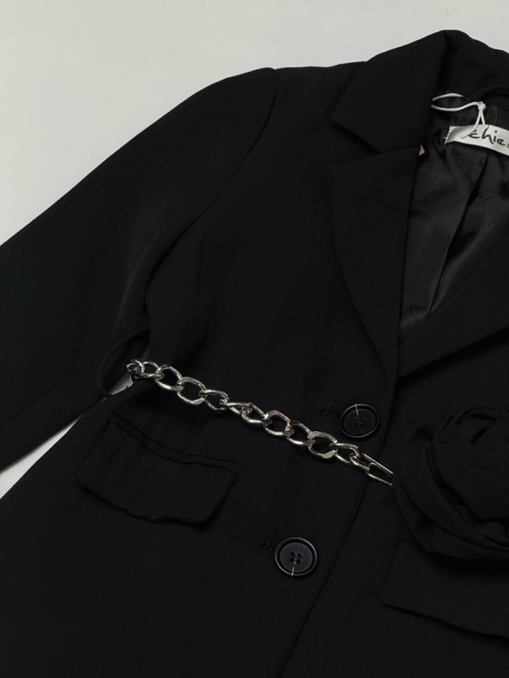 Подовжений класичний піджак з ніжним та об’ємним акцентом на поясі. Ремінець – вдале поєднння вишуканості та сучасності. Одна половина задекорована елегантною трояндою з тієї ж тканими що і піджак та прикріплена на еластичній тканинній резинці. Інша половина – срібний масивний ланцюжок, який створює контаст легкому декору. Застібається на ґудзики. Має дві практичні нашиті кишеньки з клапаном, де можна надійно збрігати дрібні речі.