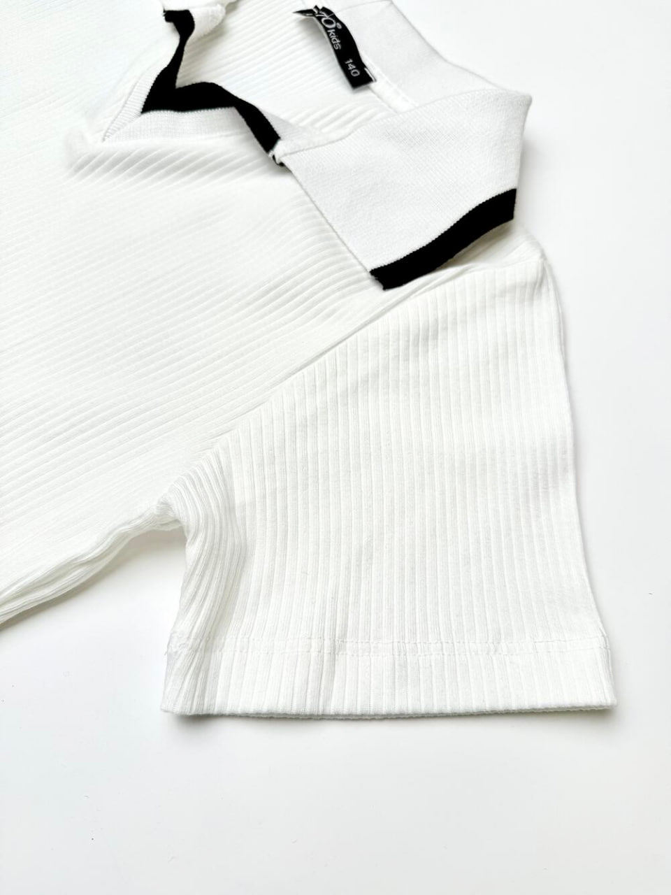 Білий колір і контрастне чорне оздоблення створюють лаконічний, але виразний образ.