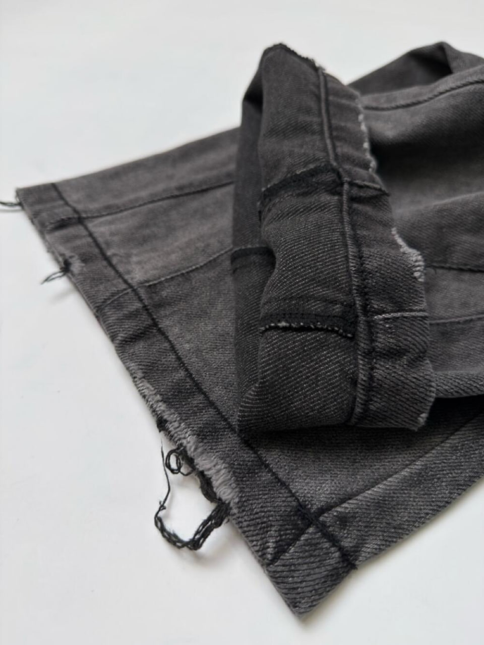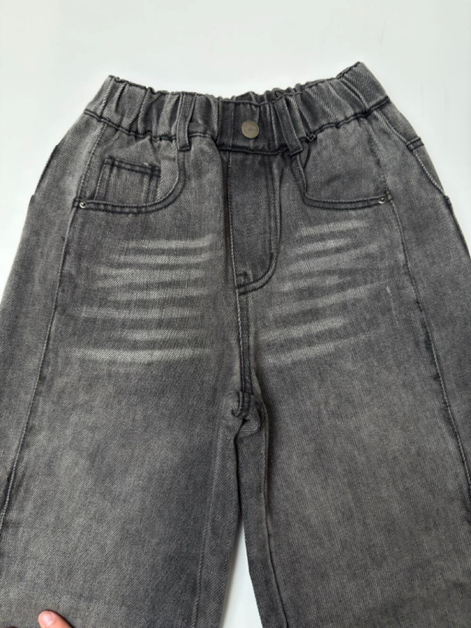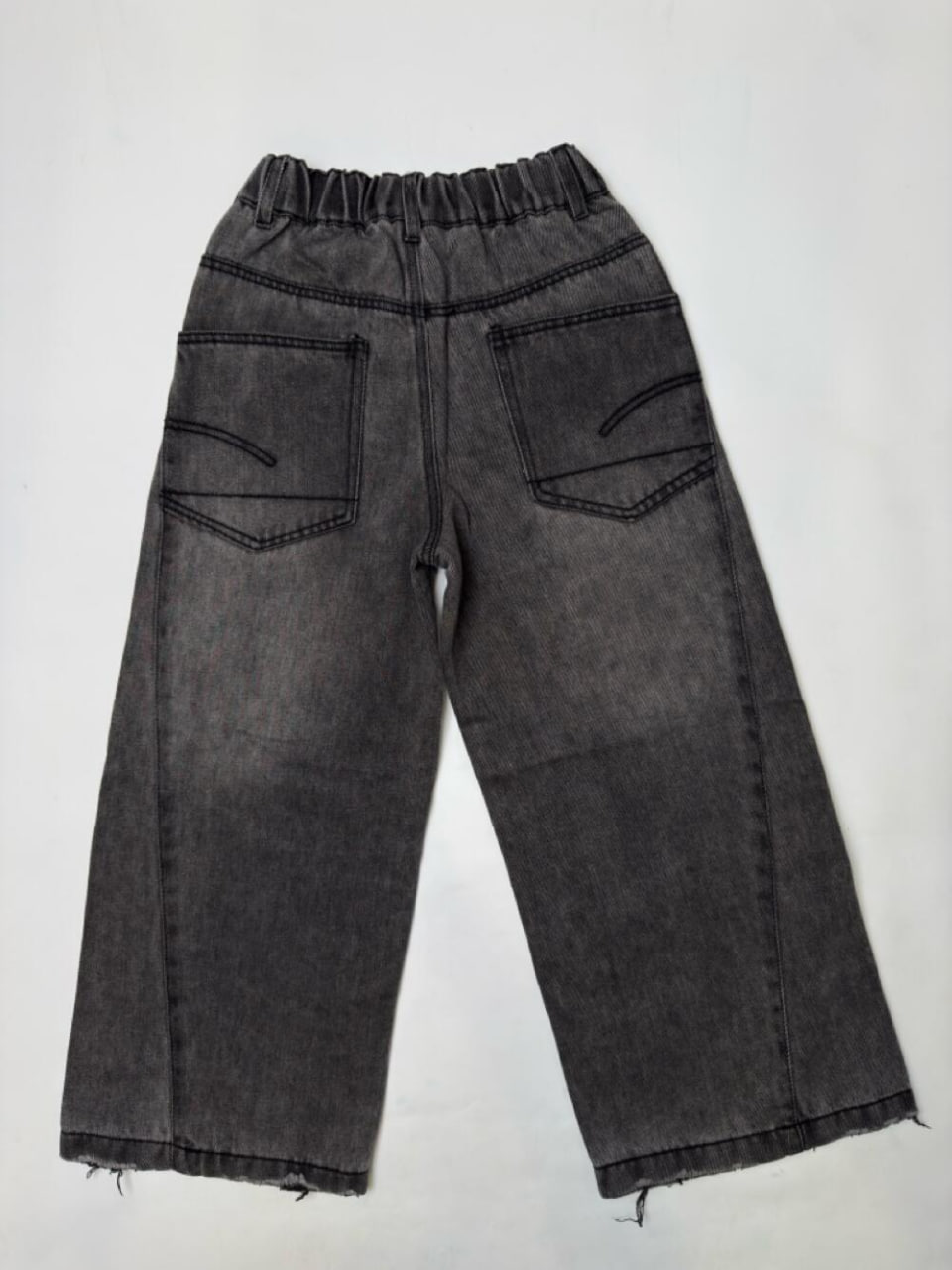 Джинси палацо в сірому кольорі з ефектом потертості, що доповнюють широкий крій та створюють особливий обєм та невагомість. На поясі регулюються еластичною резинкою та мають декоративний металевий ґудзик. Додатково є петлі для ременя. Акцентний об’ємний зовнійшній шов з кожного боку плавно скошений майже до центру, створює стильний симетричний дизайн. Доповнюють декілька ліній по центру вгорі з обох боків, які на тон світліші джинсів. Функціональні врізні кишені по боках та накладні позаду з цікавим оформленням у вигляді нашитих ліній додають практичності та завершують стильний образ.
