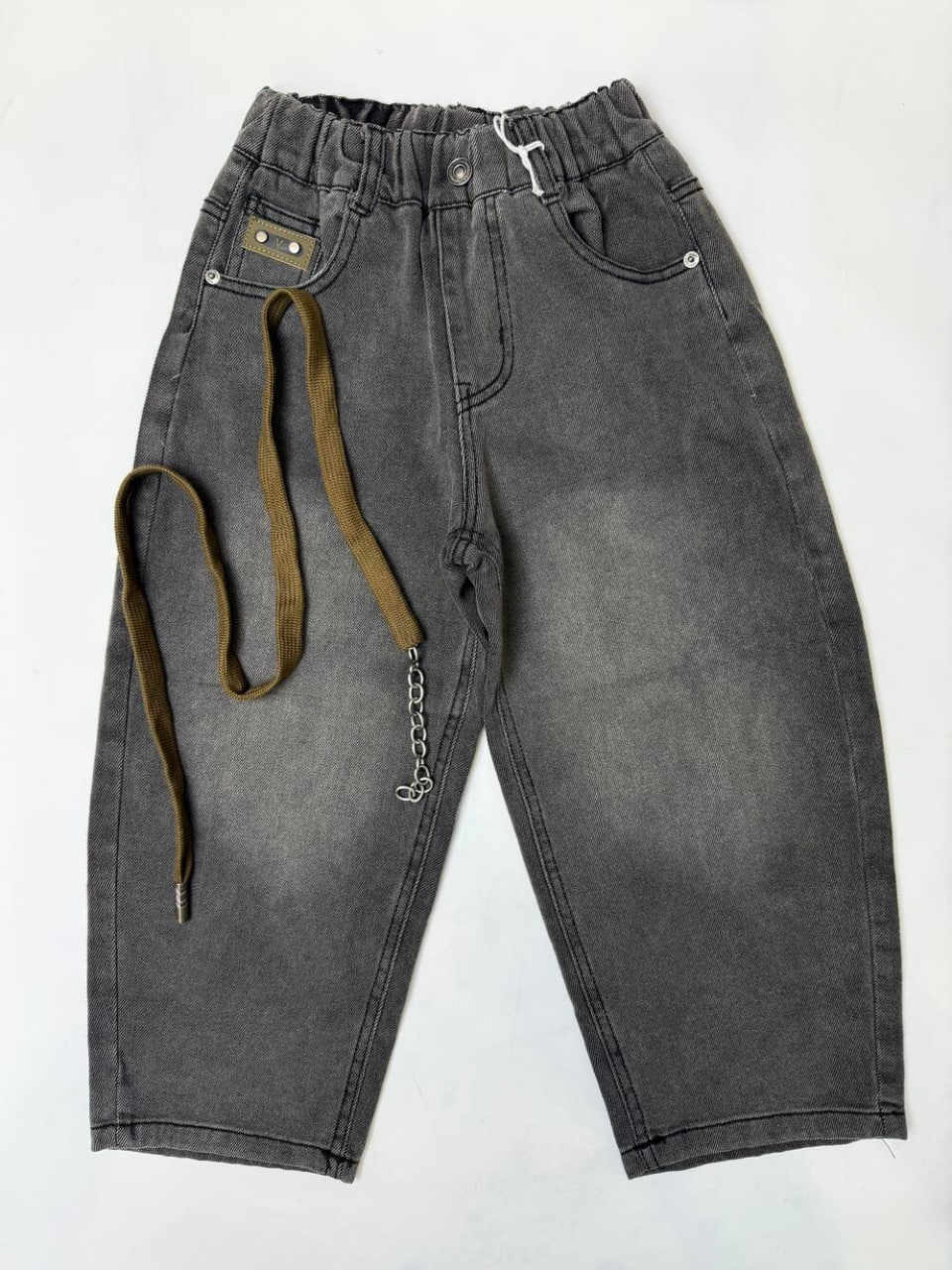 Сучасна модель у вуличному стилі з легкою потертістю та оригінальним ременем у комплекті. Пояс на резинці забезпечує зручну посадку, ззаду — дві накладні кишені з нашивками.
