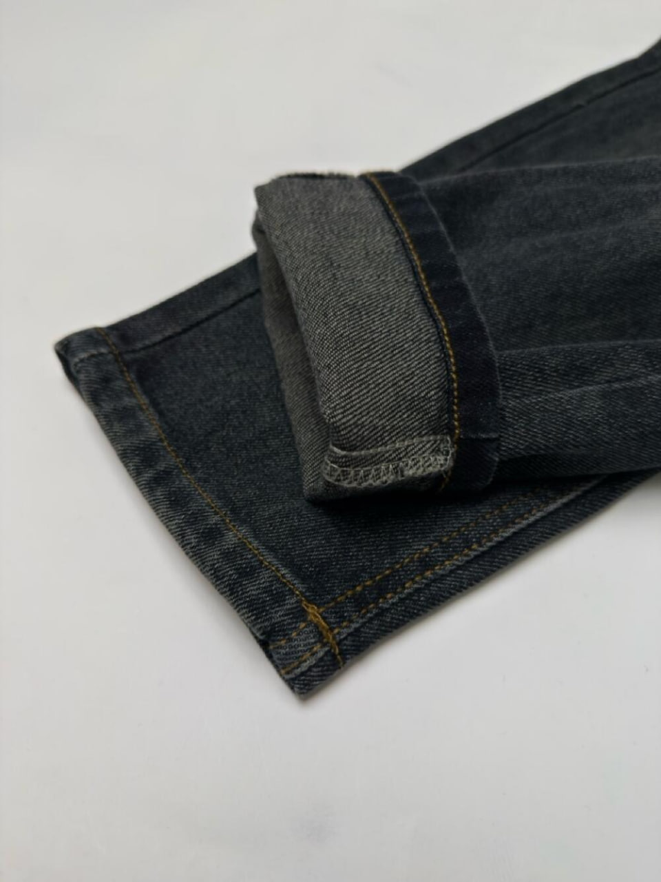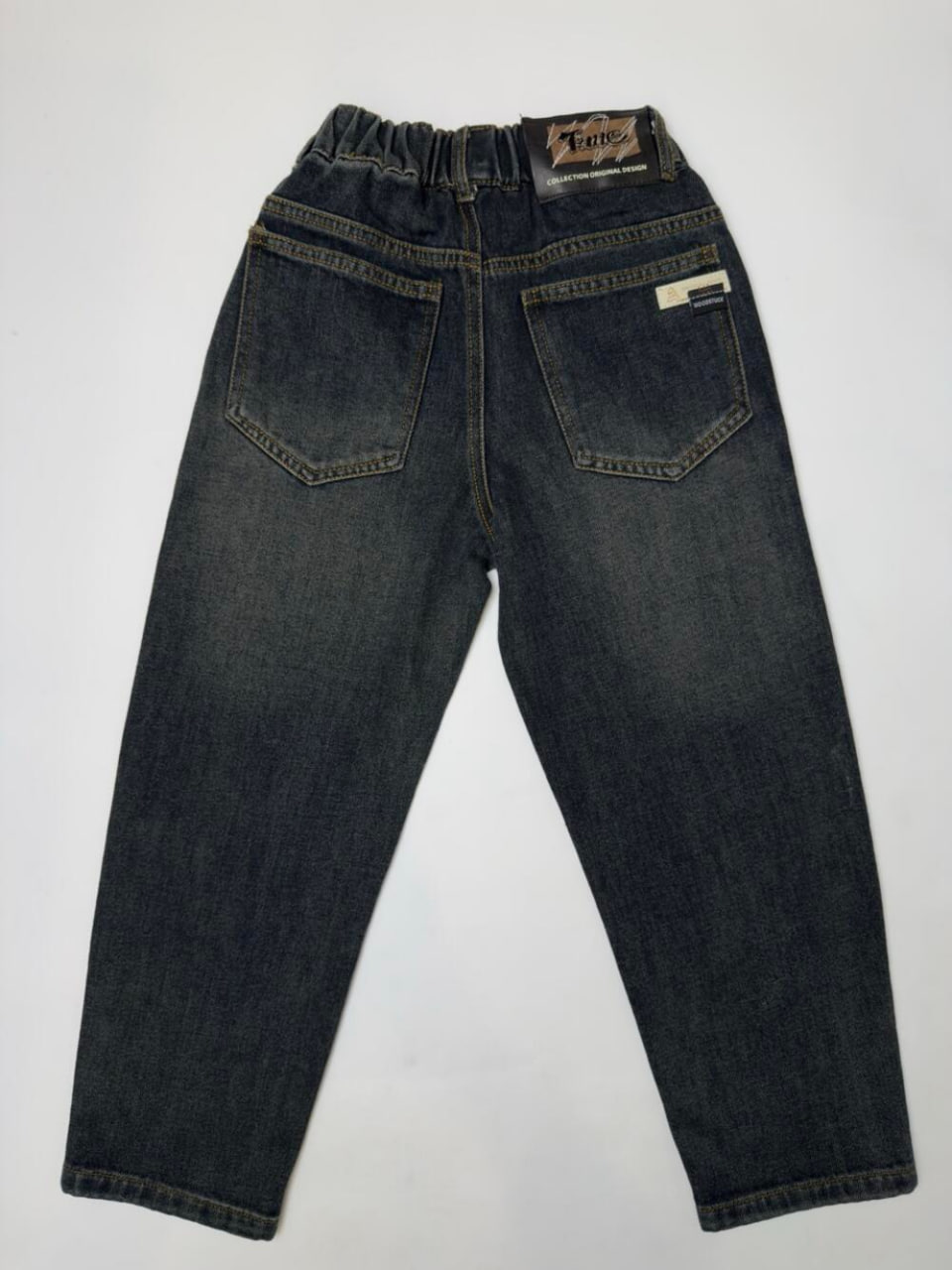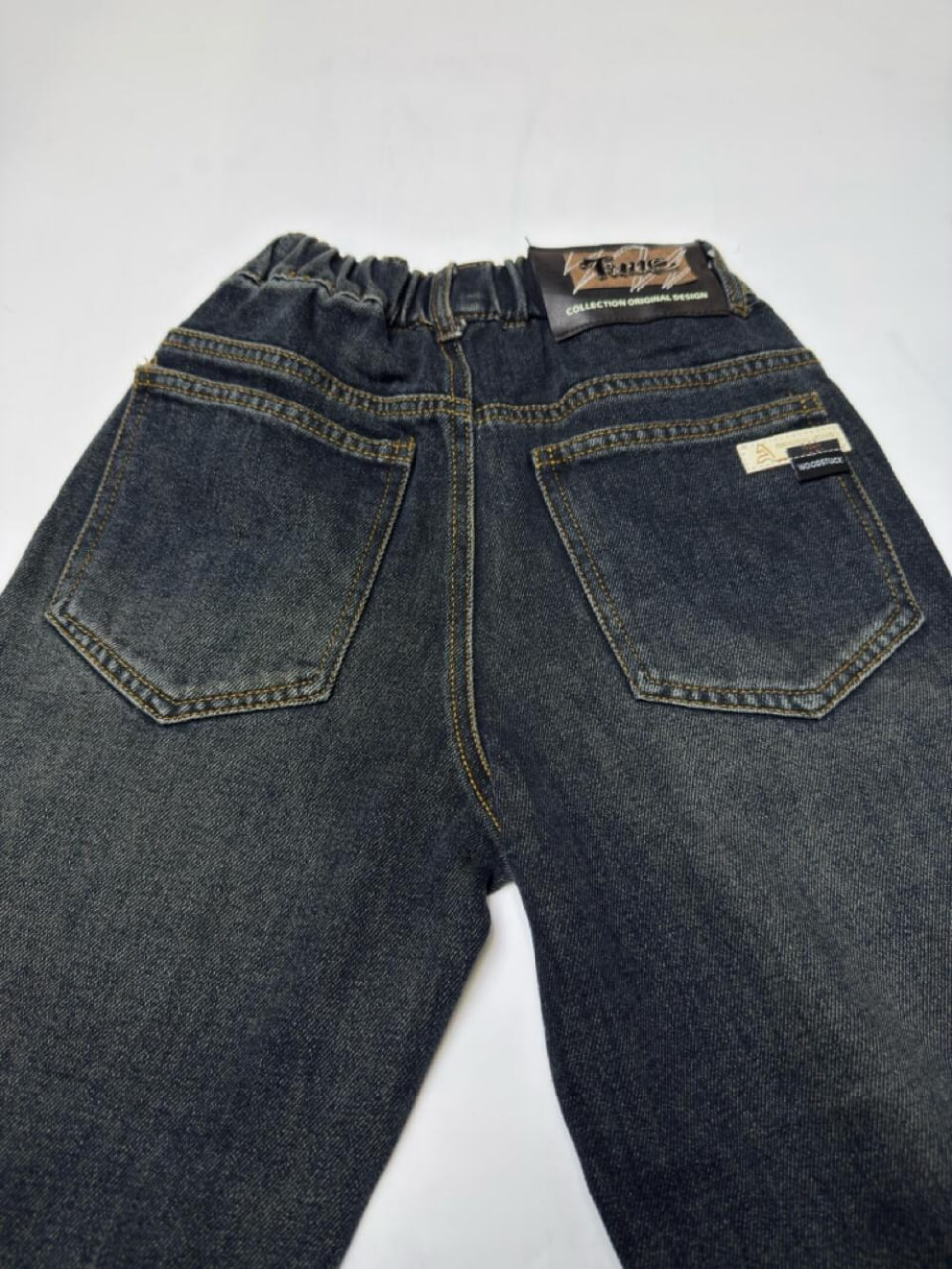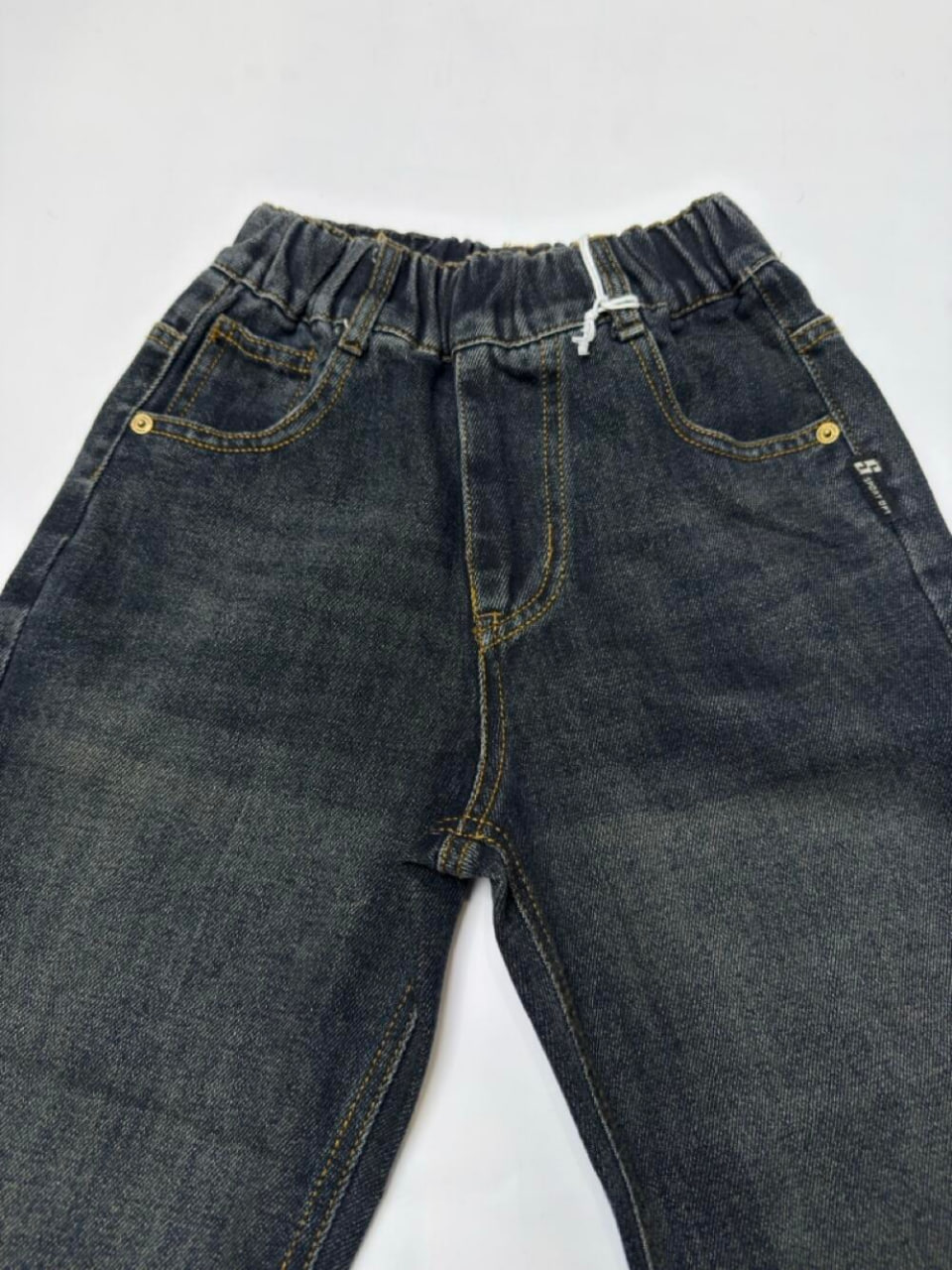 Джинси з м’якого деніму з ефектом легкого затемнення. Пояс на еластичній резинці з декоративним гудзиком забезпечує зручну посадку. Є петельки для ременя, спереду та ззаду — функціональні кишені.