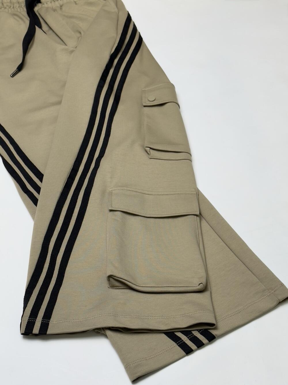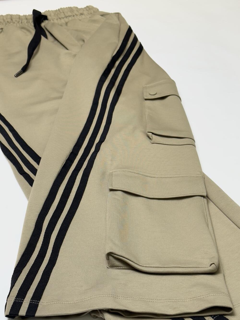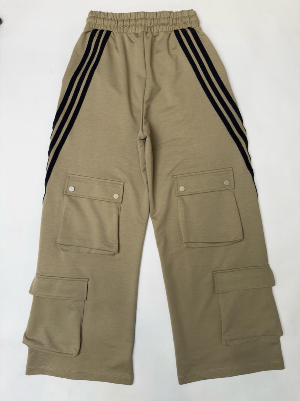 Штани палацо зі стильними спортивними елементами у вигляді трьох повздовжних ліній, які починаючи від пояса, симетрично по боках плавно зміщуються майже до центру внизу.