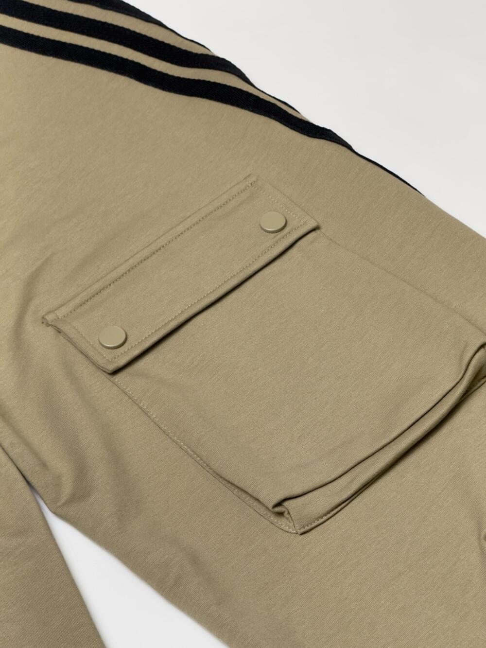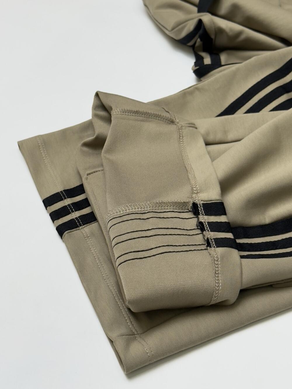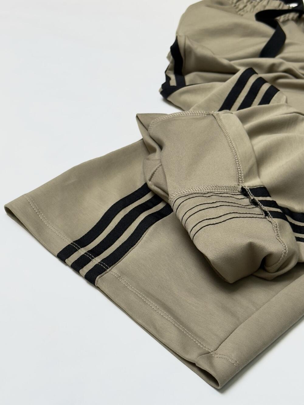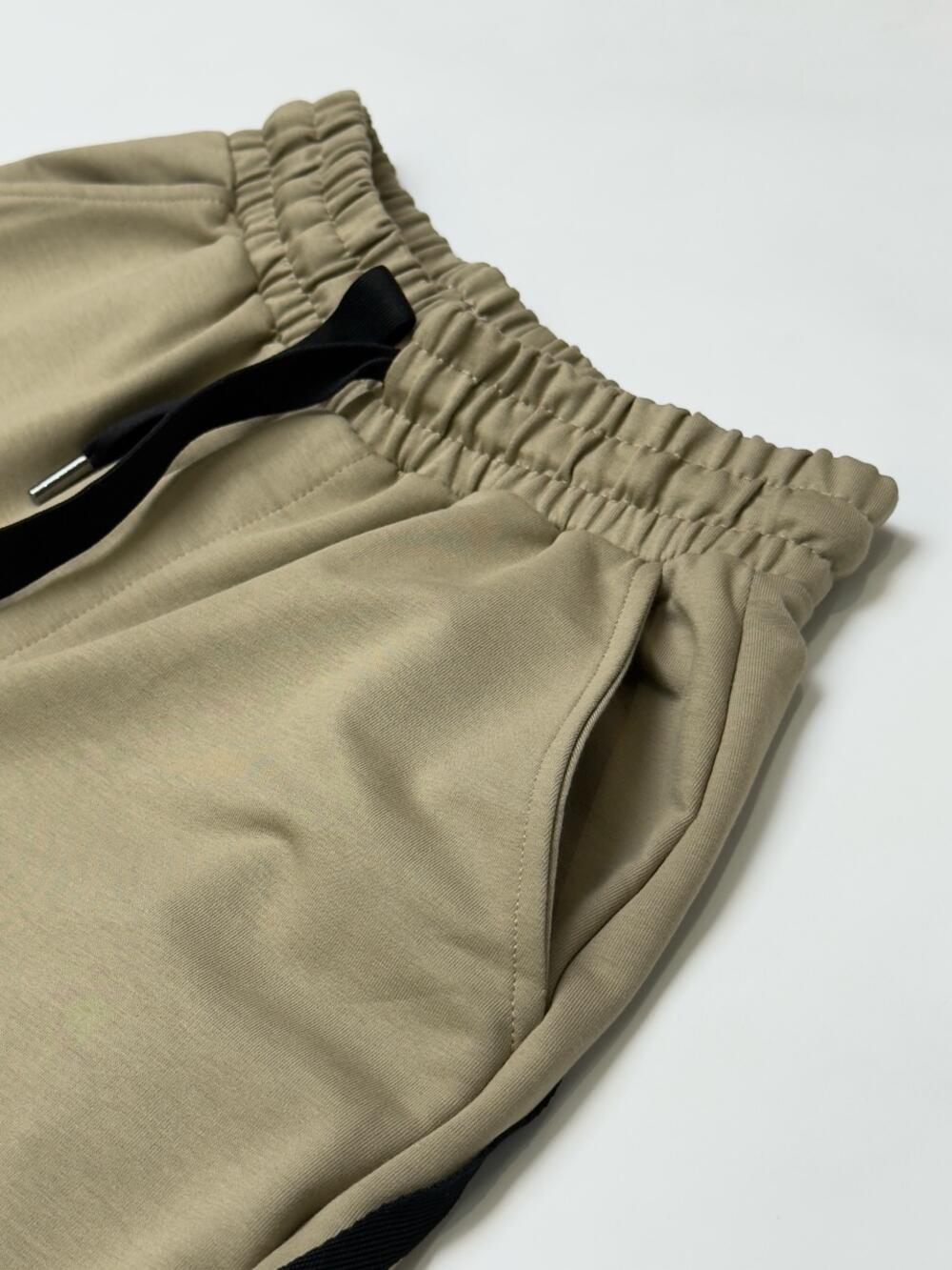 Штани палацо зі стильними спортивними елементами у вигляді трьох повздовжних ліній, які починаючи від пояса, симетрично по боках плавно зміщуються майже до центру внизу.