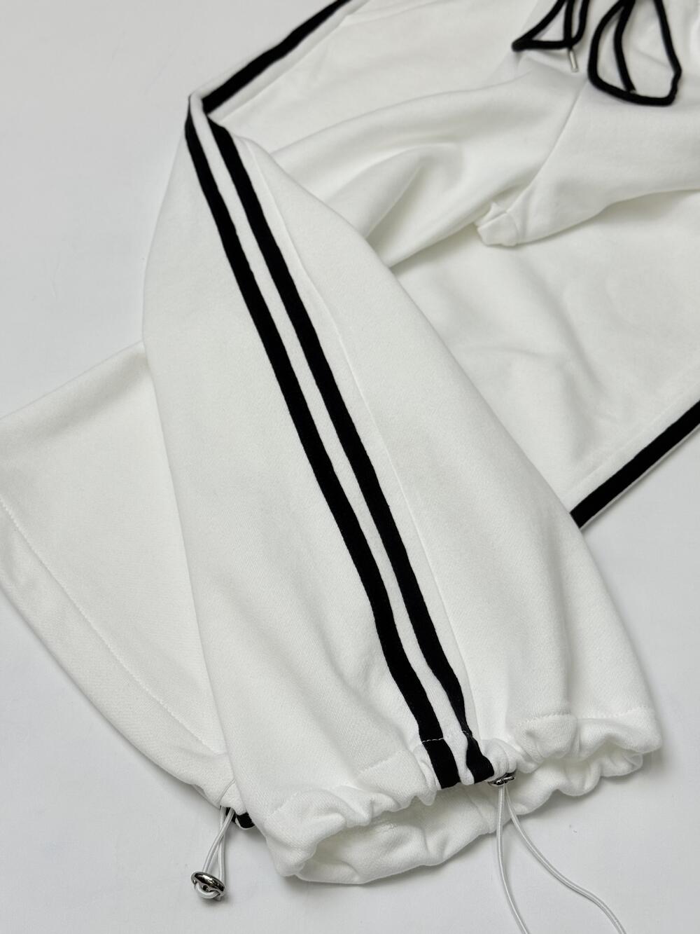 Стильні штани у спортивному стилі. Універсальний дизайн та крій створюють вшиті знизу шнурки, які регулюють силует згідно до ваших вподобань та настрою: вільного крою- палацо чи зібрані внизу- джогери. Елегантна спортивна стилістика додана у вигляді двох чорних полосок з кожного боку.