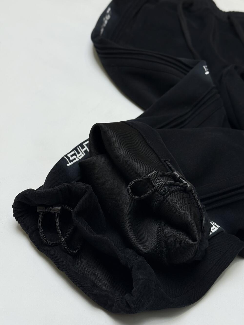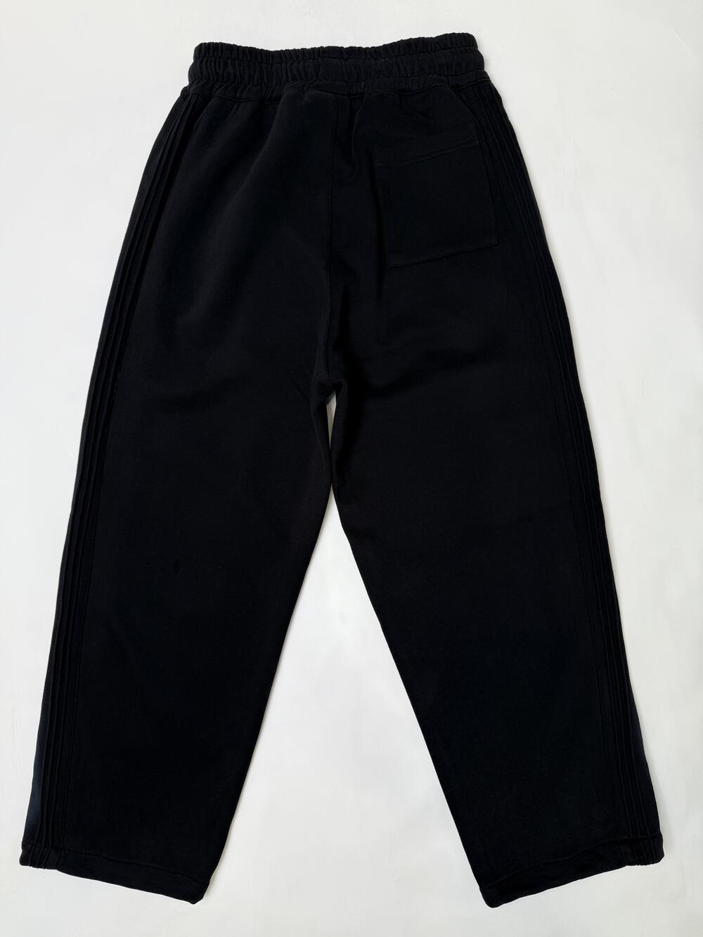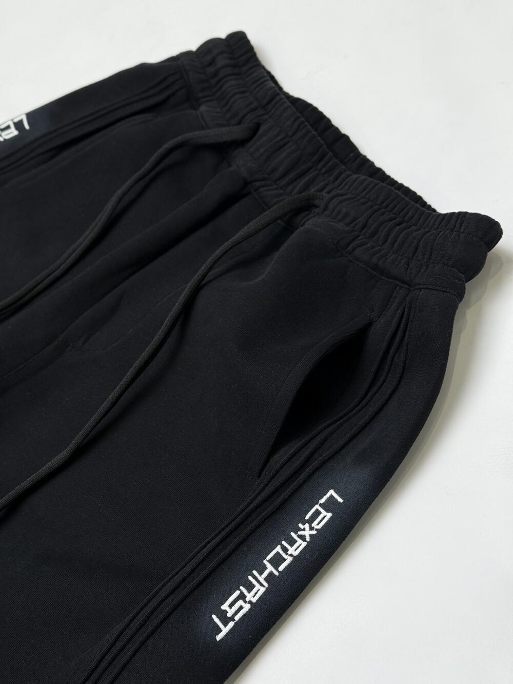 Спортивні штани. Універсальний дизайн та крій створюють вшиті знизу шнурки, які регулюють силует згідно до ваших вподобань та настрою: вільного крою чи зібрані внизу- джогери. Трендовості додає ефкект потертості, поверх з нашитим надписом, розташованих рівномірно по всій бічній зовнішній стороні та обрамлені текстурними об’ємнини лініями з такої ж тканини що і штани. Така композиція робить штани сучасним та практичним елементом гардеробу. Зручні прорізні кишені по боках та одна нашита кишеня позаду.
