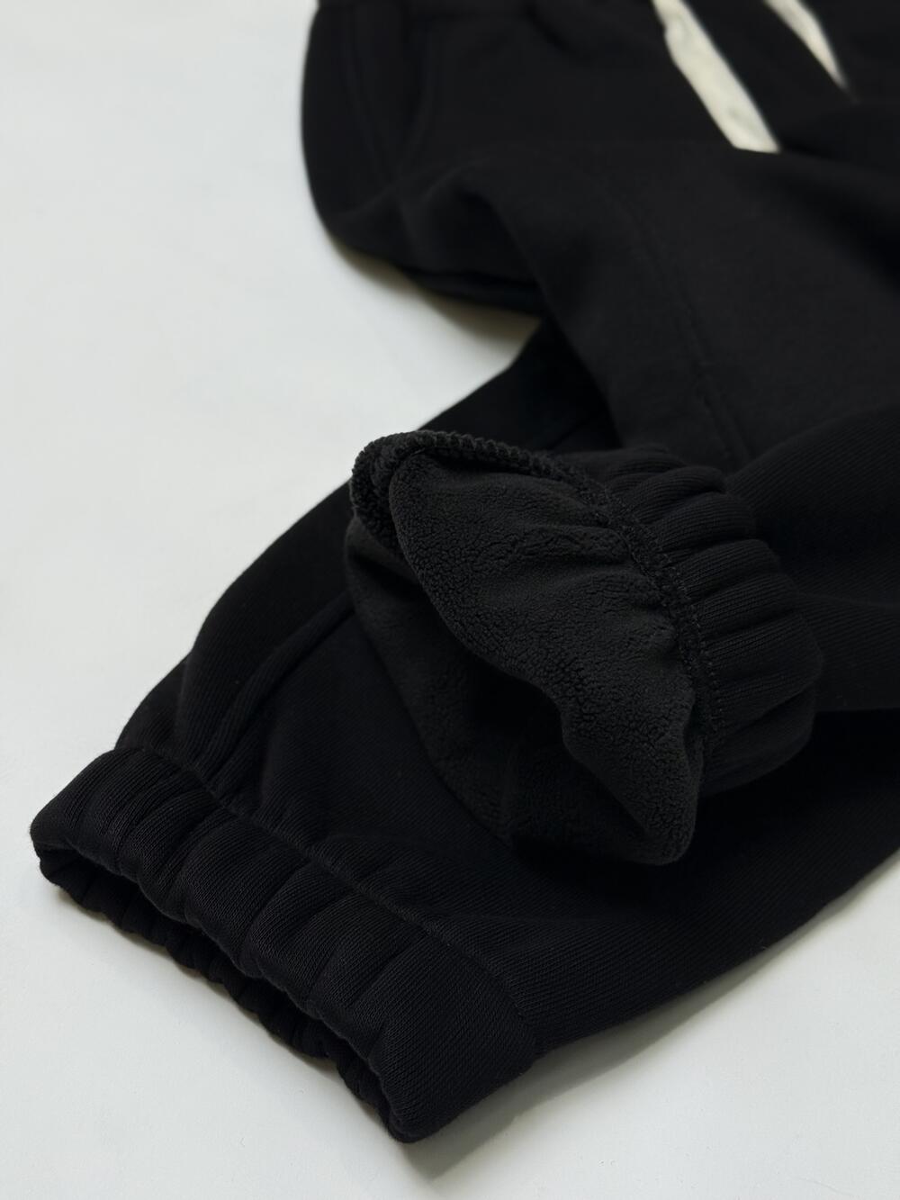 Модель із начосом усередині — м’яка, тепла й комфортна для щоденного носіння. На передній частині — вишита літера “R”, що додає мінімалістичного акценту. Пояс на еластичній резинці з контрастним шнурком для регулювання. Манжети знизу забезпечують зручну посадку й захищають від холоду. Базова модель, яка поєднує стиль, практичність і комфорт.
