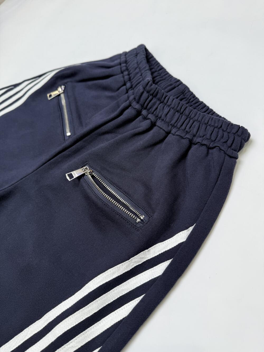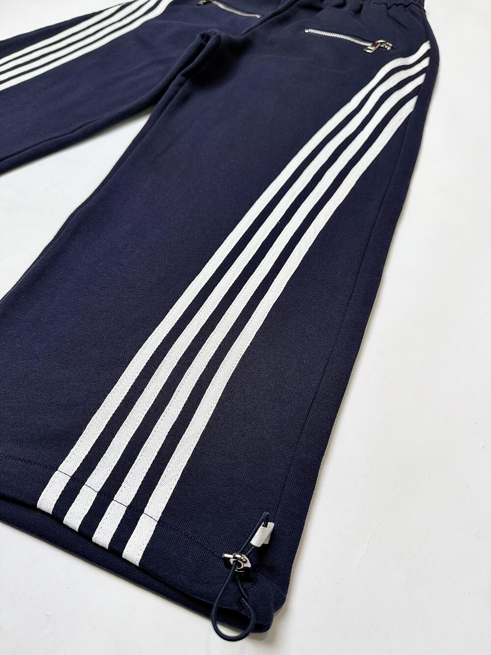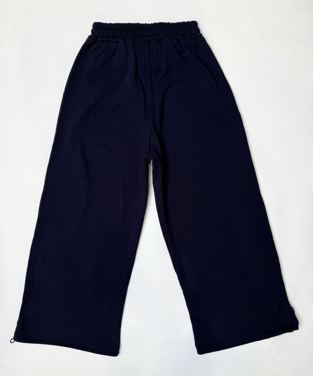 Комфортна модель вільного крою з білими лампасами по боках — акцент, що додає динаміки та стилю. Знизу вшиті шнурки для регулювання ширини: можна носити як палацо або як джогери. Попереду — дві зручні кишені на блискавках. Пояс на м’якій еластичній резинці. Тканина приємна на дотик, добре тримає форму й забезпечує комфорт у щоденному носінні.