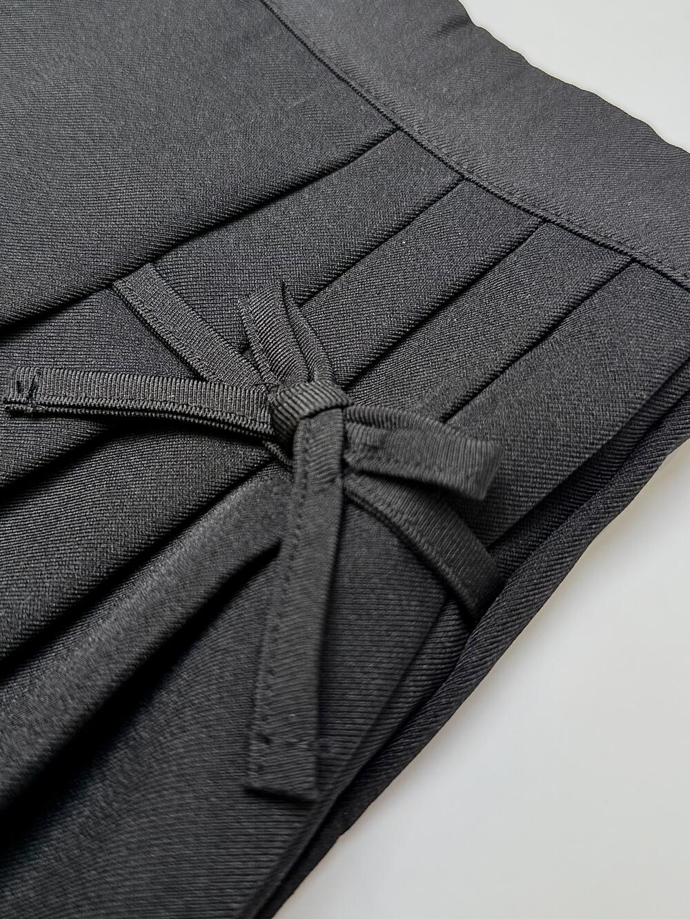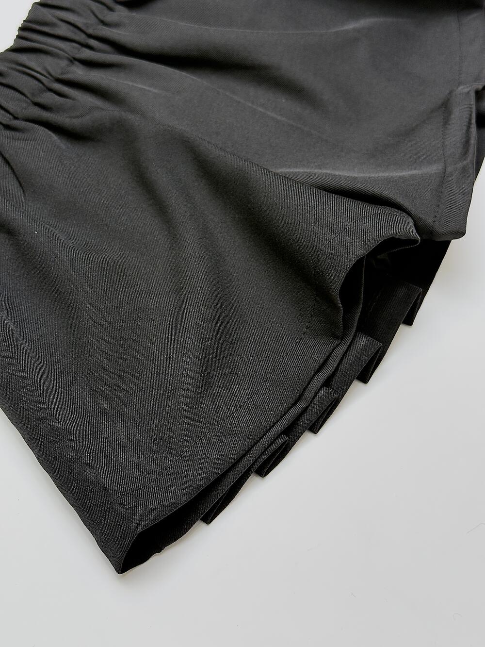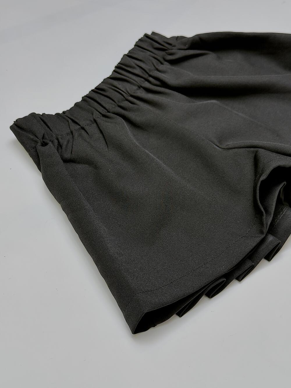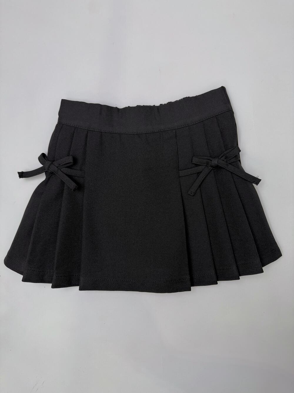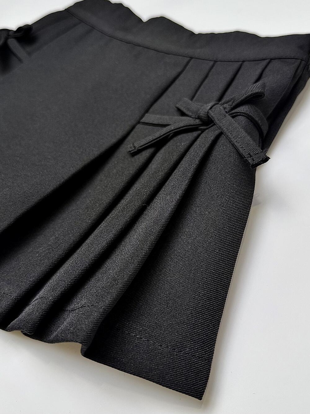 Стильна спідниця-шорти. Лаконічний дизайн створюють плісеровані вставки з двох боків, а мінімалістичний акцент на них додає бант з кожного боку. Всі елементи виконані з однієї мякої фактурної тканини. Елегатний вигляд спереду поєднується з комфртними шортами позаду та еластичною резинкою в поясі. Вишуканий та практичний вибір для гардеробу справжньої модниці.