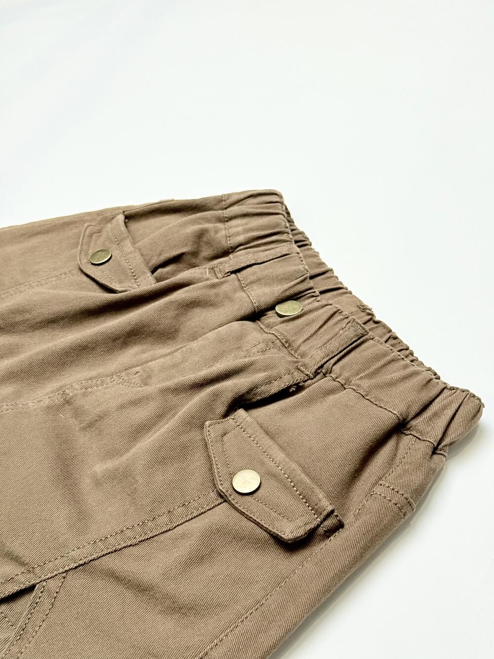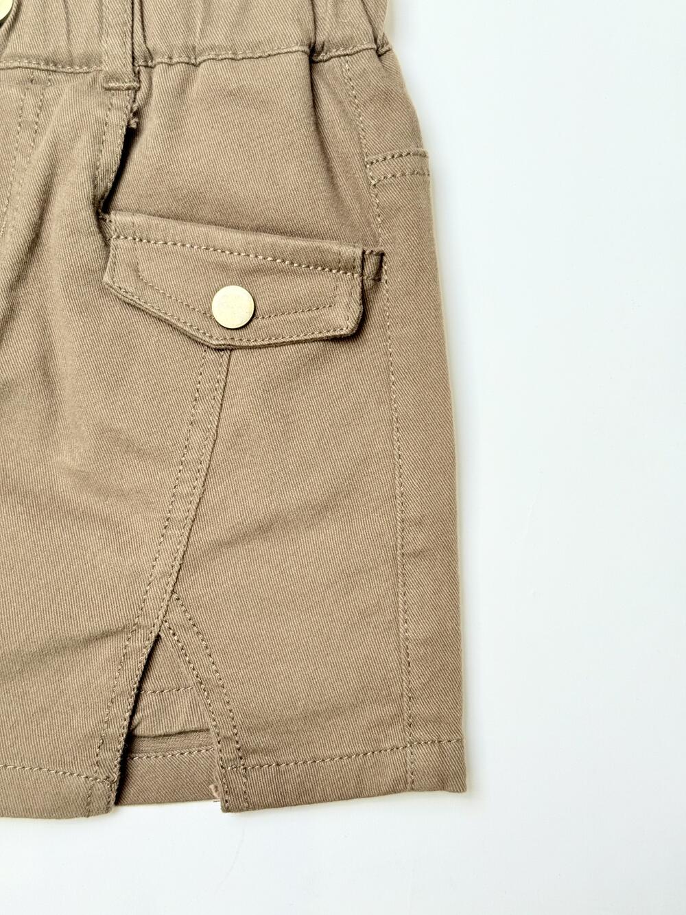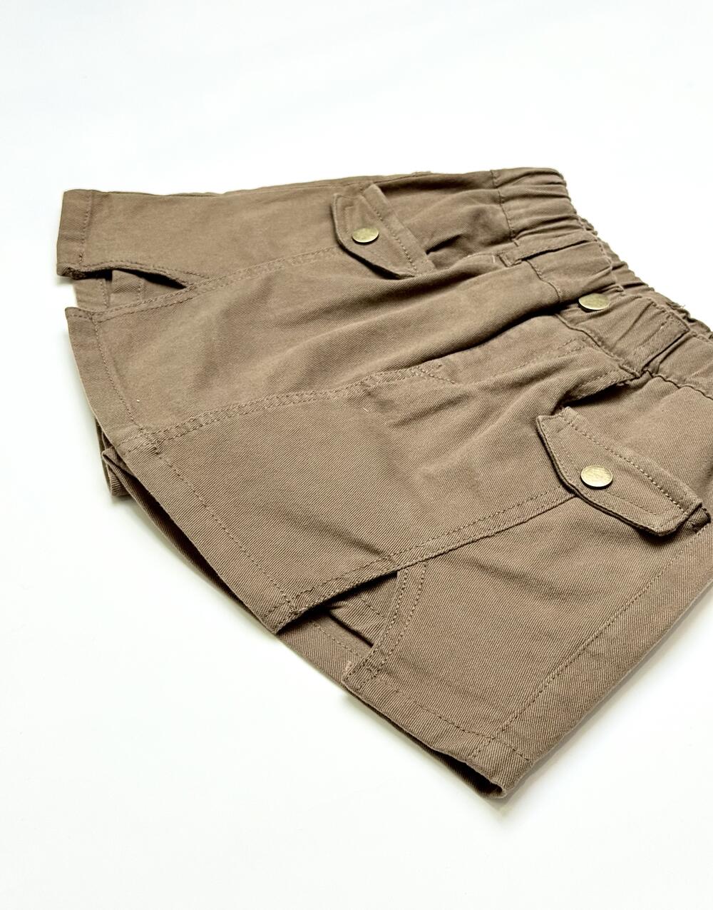 Модель із м’якого стрейч-котону. Спереду — накладні кишені з клапанами та декоративними ґудзиками, позаду еластичний пояс для зручної посадки. Поєднує вигляд спідниці та комфорт шортів, зручна для щоденного носіння.