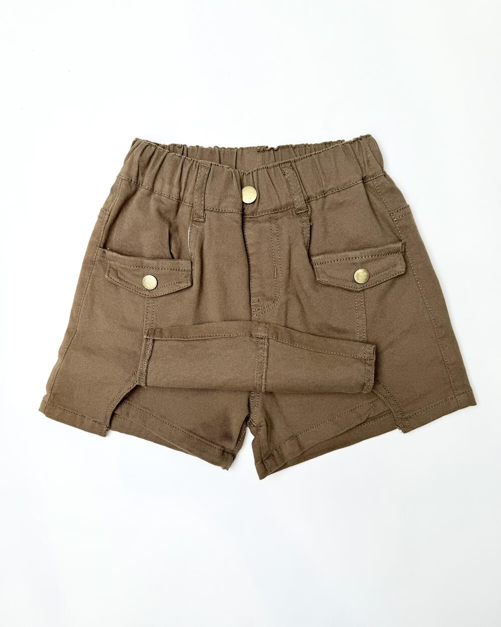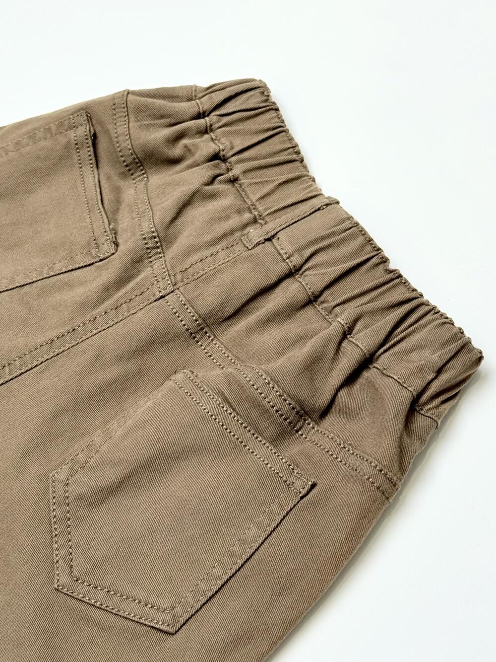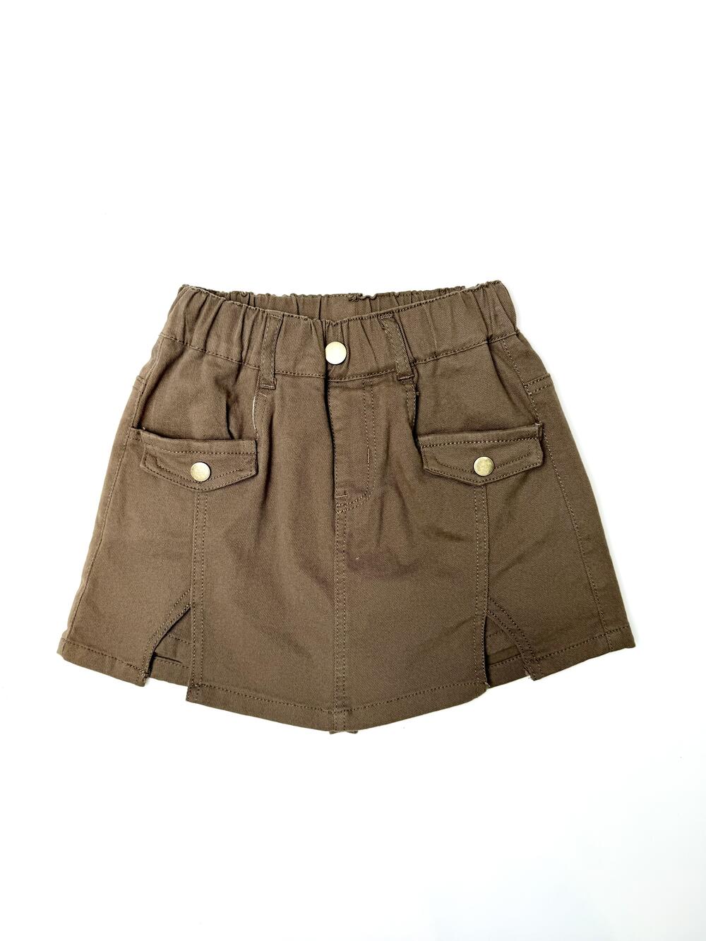 Модель із м’якого стрейч-котону. Спереду — накладні кишені з клапанами та декоративними ґудзиками, позаду еластичний пояс для зручної посадки. Поєднує вигляд спідниці та комфорт шортів, зручна для щоденного носіння.