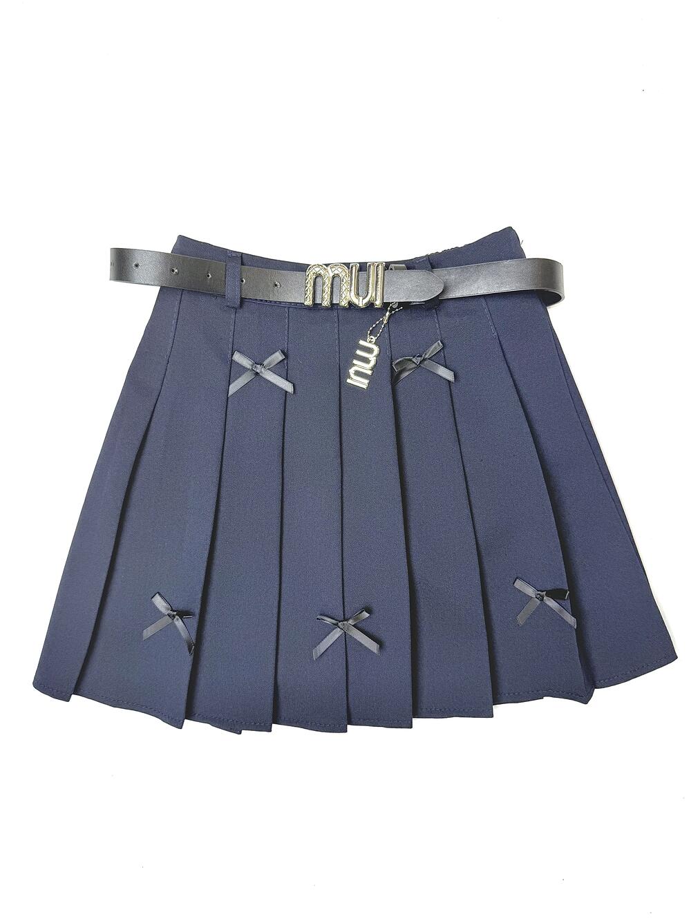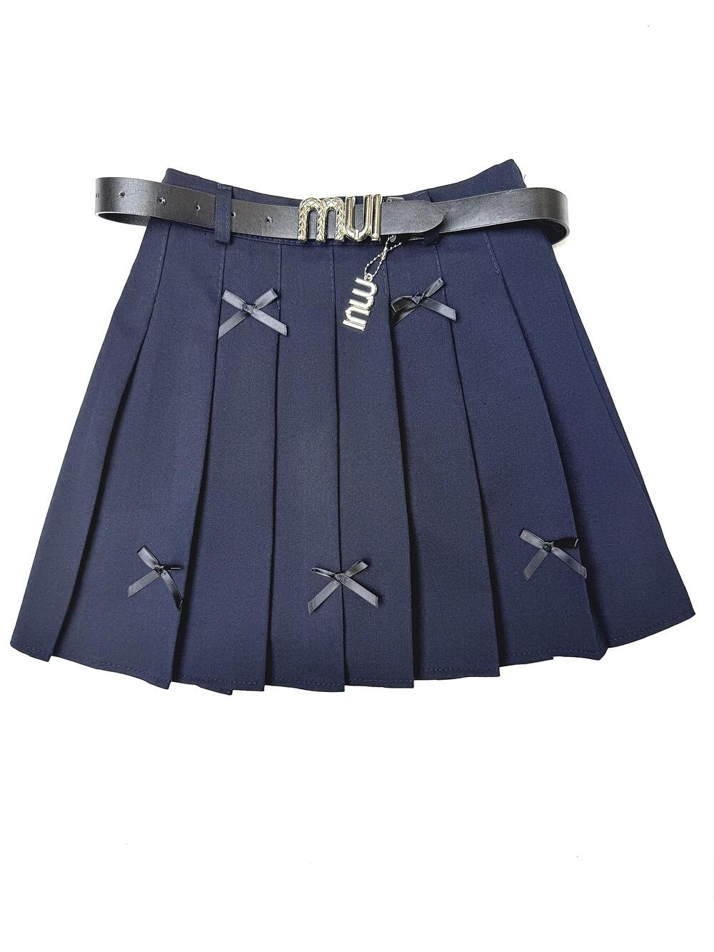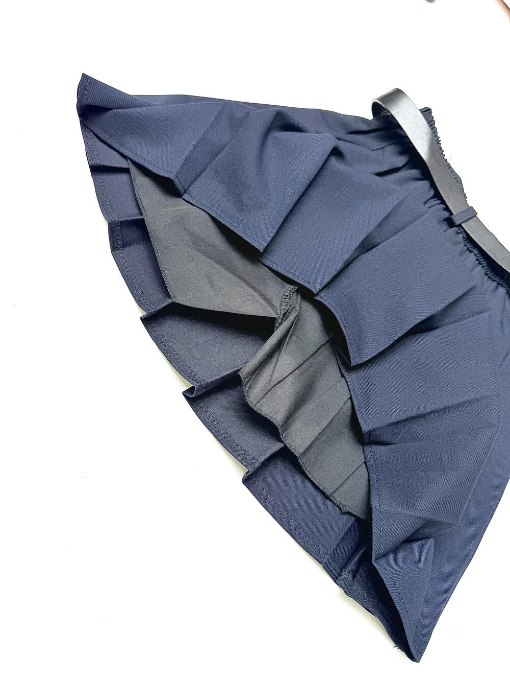 Однотонна плісирована спідниця глибокого синього кольору з акуратними бантиками на складках створює охайний і водночас святковий вигляд.