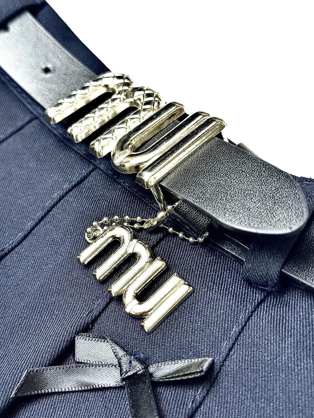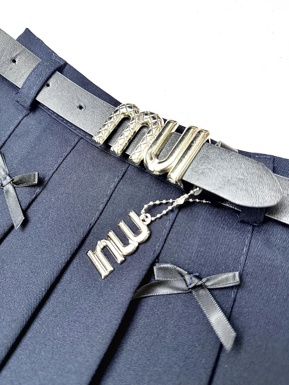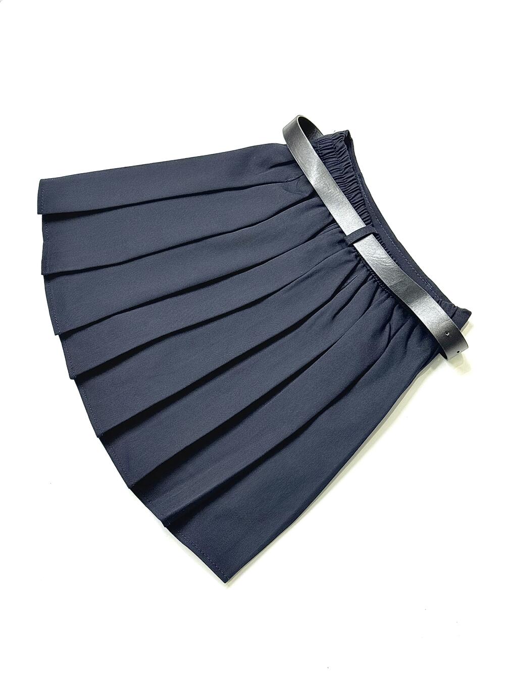 Однотонна плісирована спідниця глибокого синього кольору з акуратними бантиками на складках створює охайний і водночас святковий вигляд.