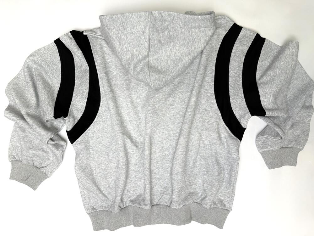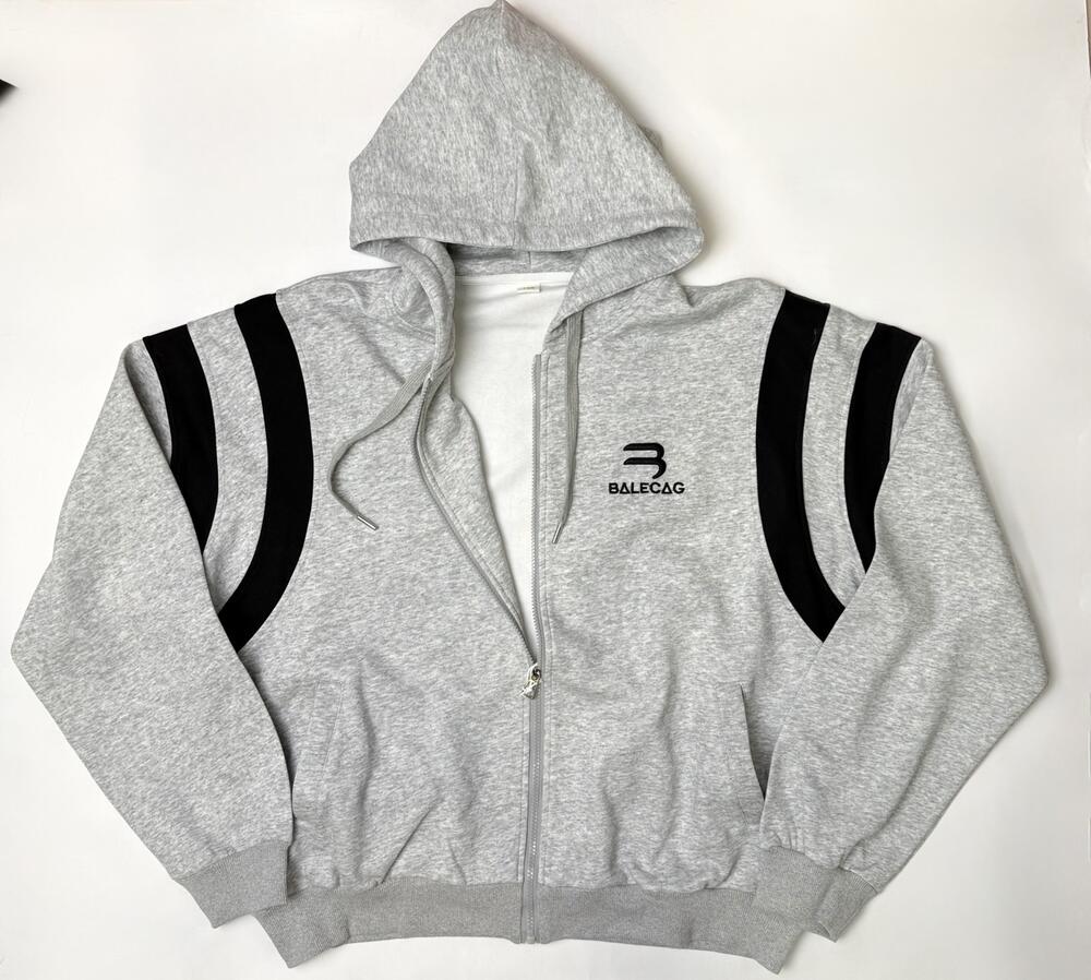 Худі на блискавці з капюшоном, чорними лампасами на рукавах і невеликим принтом спереду. Манжети та низ — на еластичній резинці для зручної посадки.