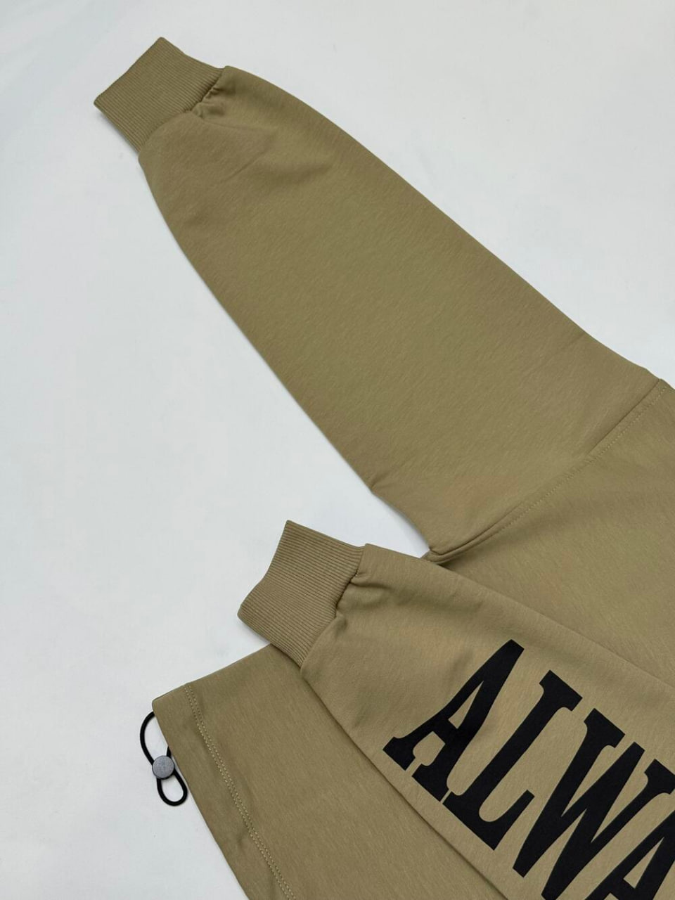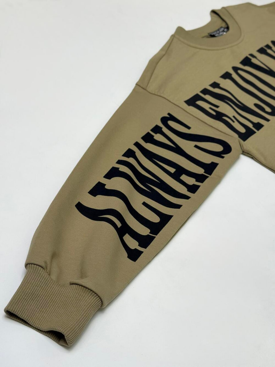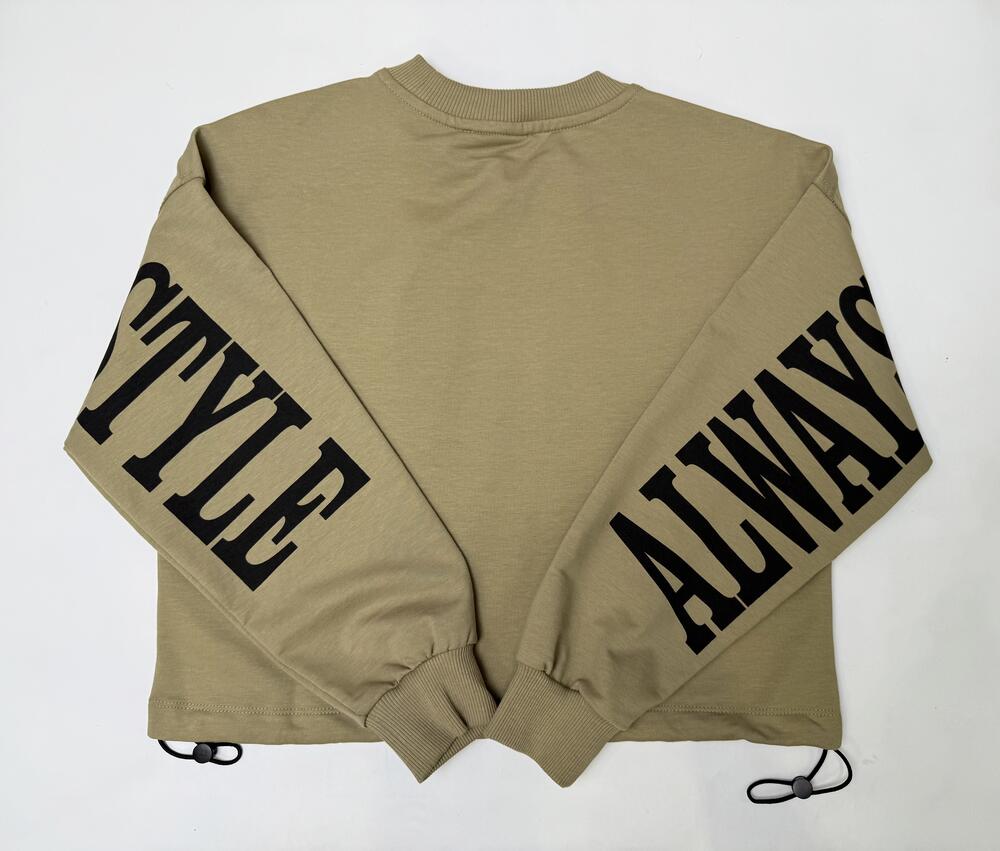 Світшот у відтінку оливи з акцентними написами на рукавах і грудях.